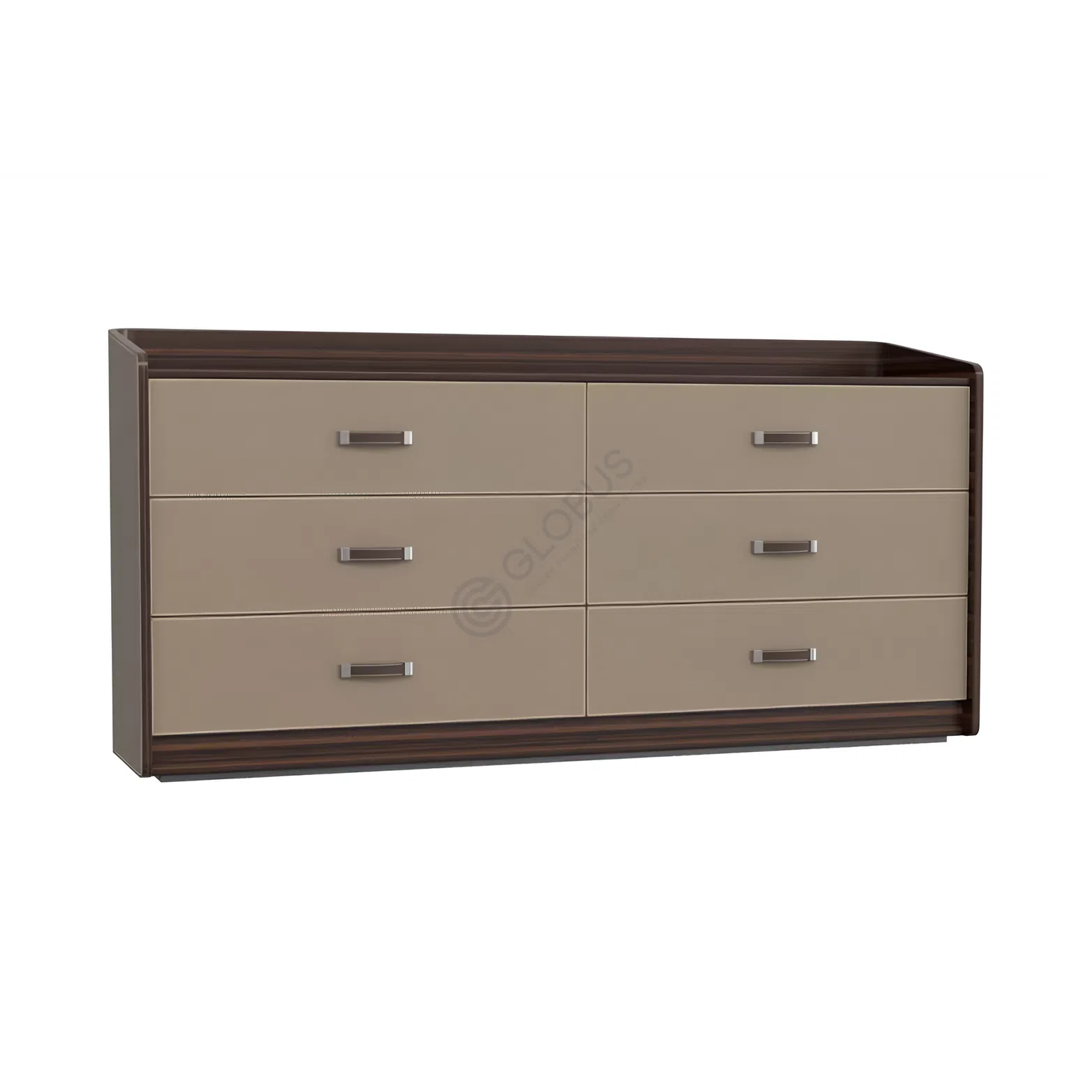 With six generously sized drawers, this chest provides ample space for organizing clothing, linens, or personal items. The top surface features a gently raised edge, creating a secure area for displaying decorative objects. This versatile unit serves as an ideal bedroom dresser or as an elegant and practical storage addition to a living area.
