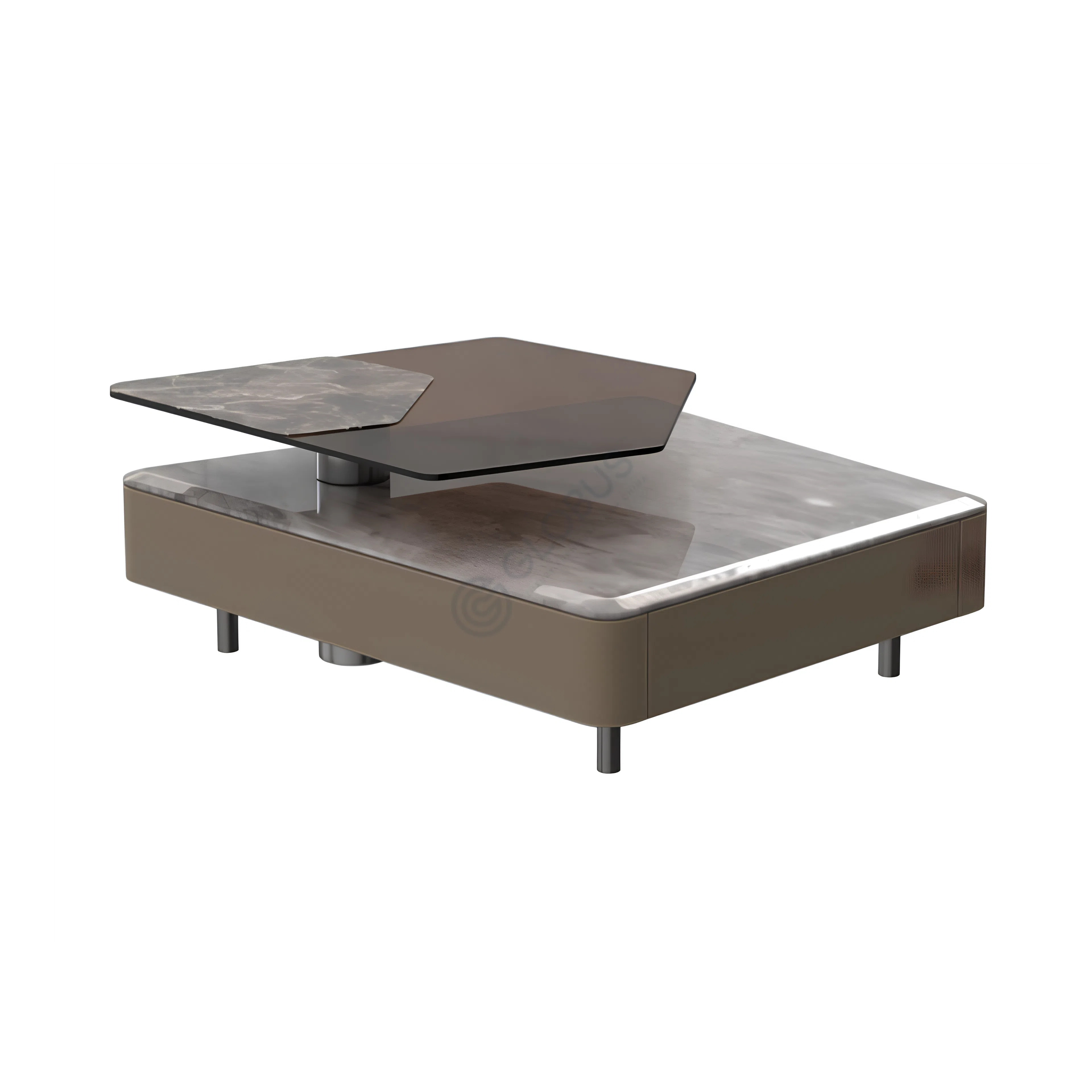 This modern side table presents a distinguished aesthetic, perfect for the contemporary living room. Its asymmetrical tabletop features a sophisticated pairing of materials, with one section showcasing the beautiful, intricate veining of sintered stone alongside a contrasting sleek, dark surface.