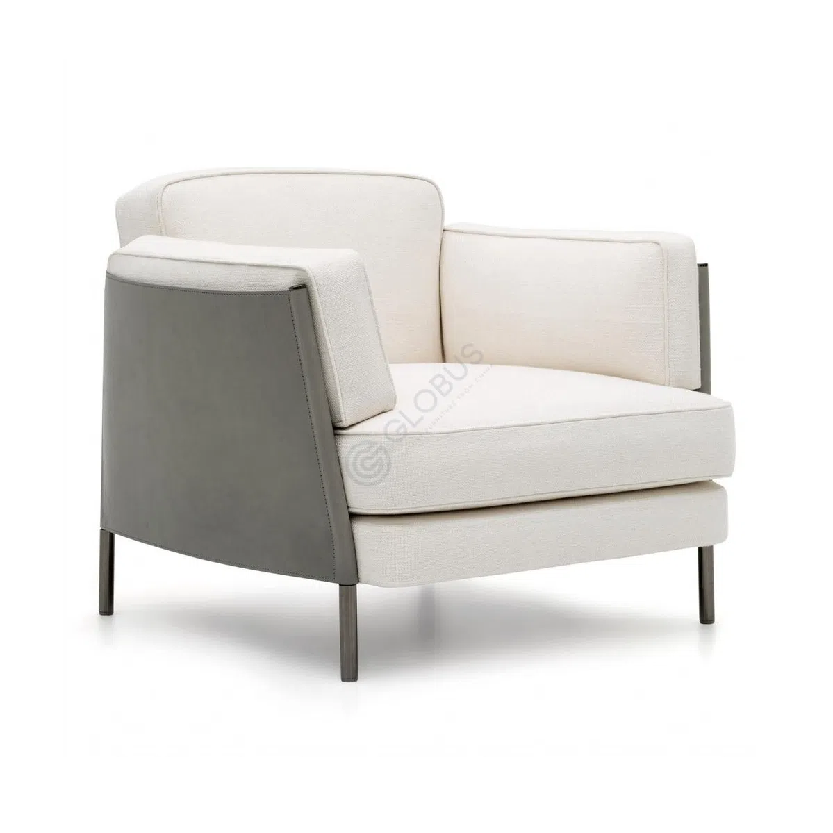 Upholstered in a finely textured textile, the seat and back exude quality and tactile appeal. A sophisticated contrast is introduced by the smooth panel on the outer arm, adding a refined detail. The chair stands on sleek, slender legs, contributing to its modern aesthetic and stability.
