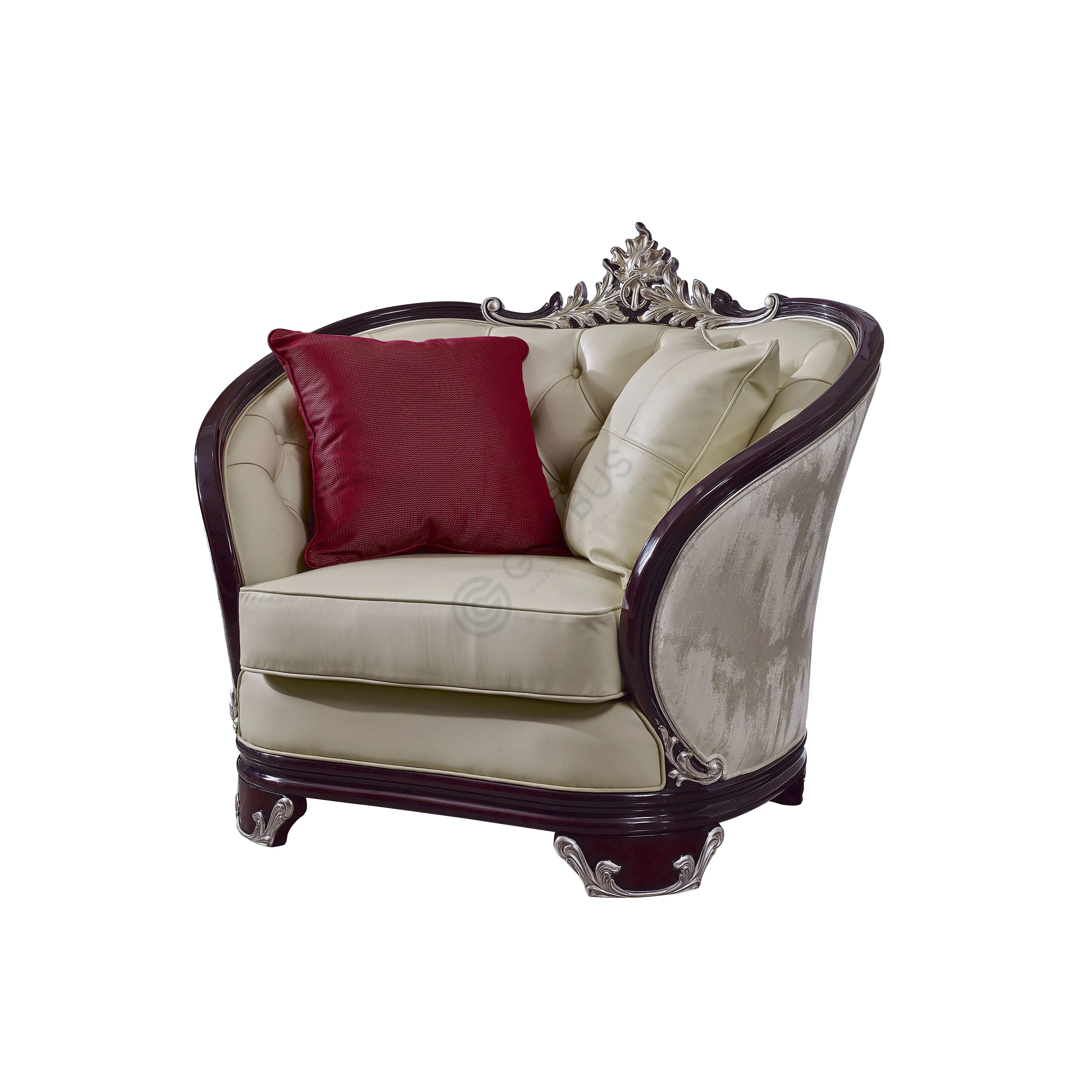 Experience the elegance of European classic design with this exquisite sofa. It features gracefully curved arms and ornate detailing, showcasing a rich blend of textile and smooth PU upholstery. The decorative carvings at the crown and base add a touch of traditional luxury, finished in a refined metallic tone that complements the dark wood frame.