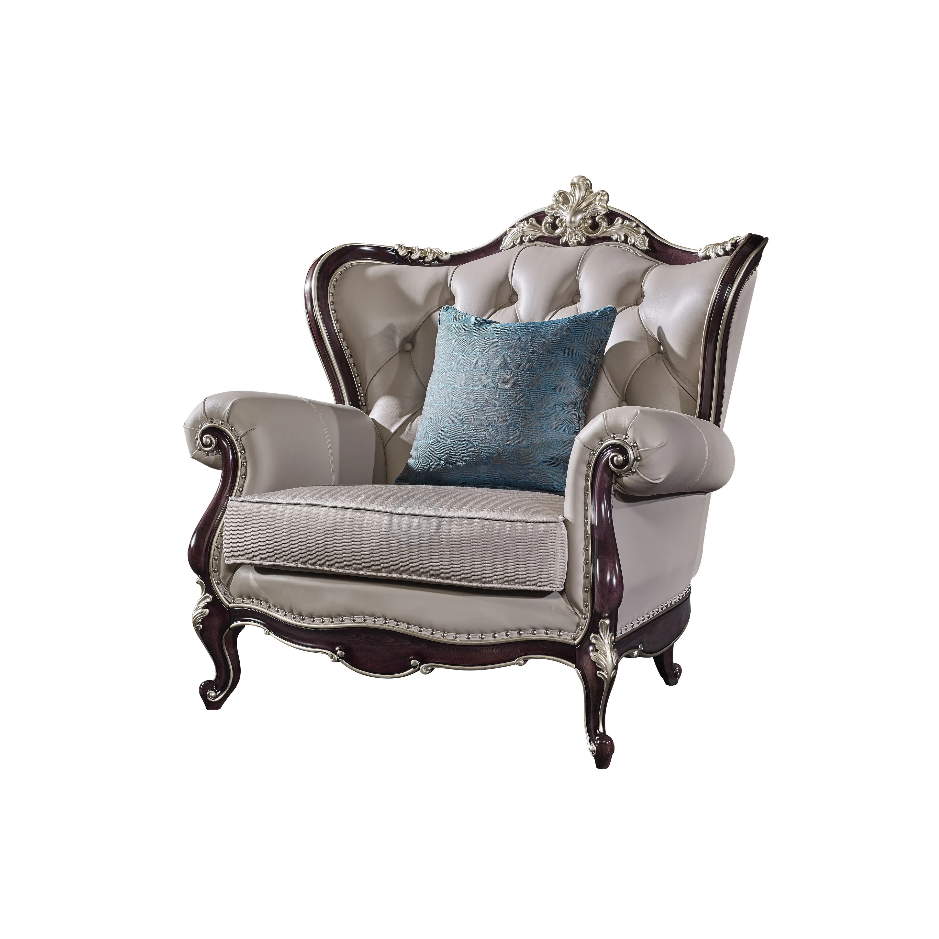 This sofa embodies classic European design, bringing timeless elegance to a living room. Its gracefully curved back and scrolled arms are beautifully accented by intricate carvings along the frame. The refined silhouette and meticulous details create a sophisticated focal point for any space.
