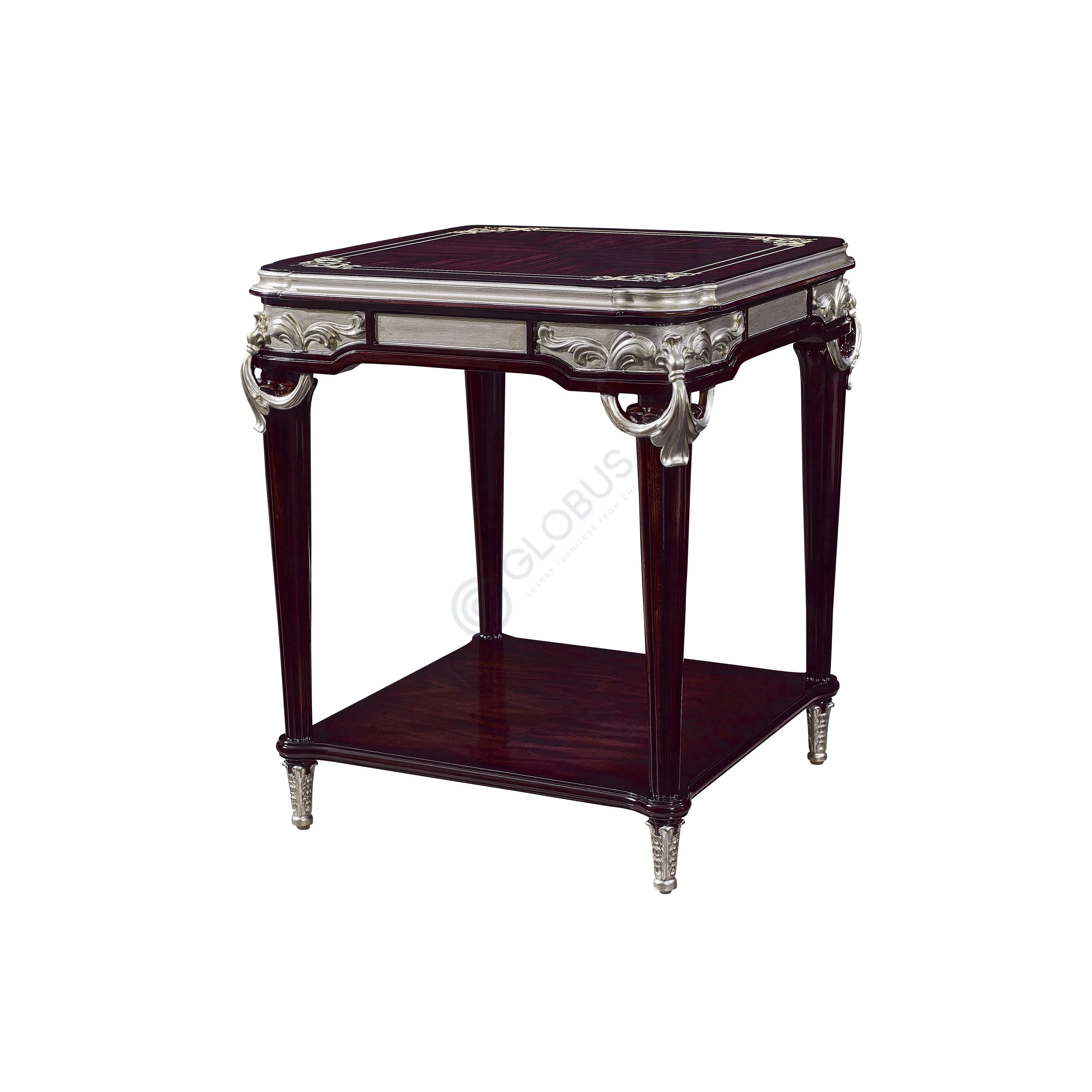Delicate carvings adorn the frame and the gracefully shaped legs, adding a touch of intricate detail characteristic of its classic design. A subtle metallic trim outlines the perimeter of both the top surface and the lower shelf, providing a sophisticated accent that catches the light.