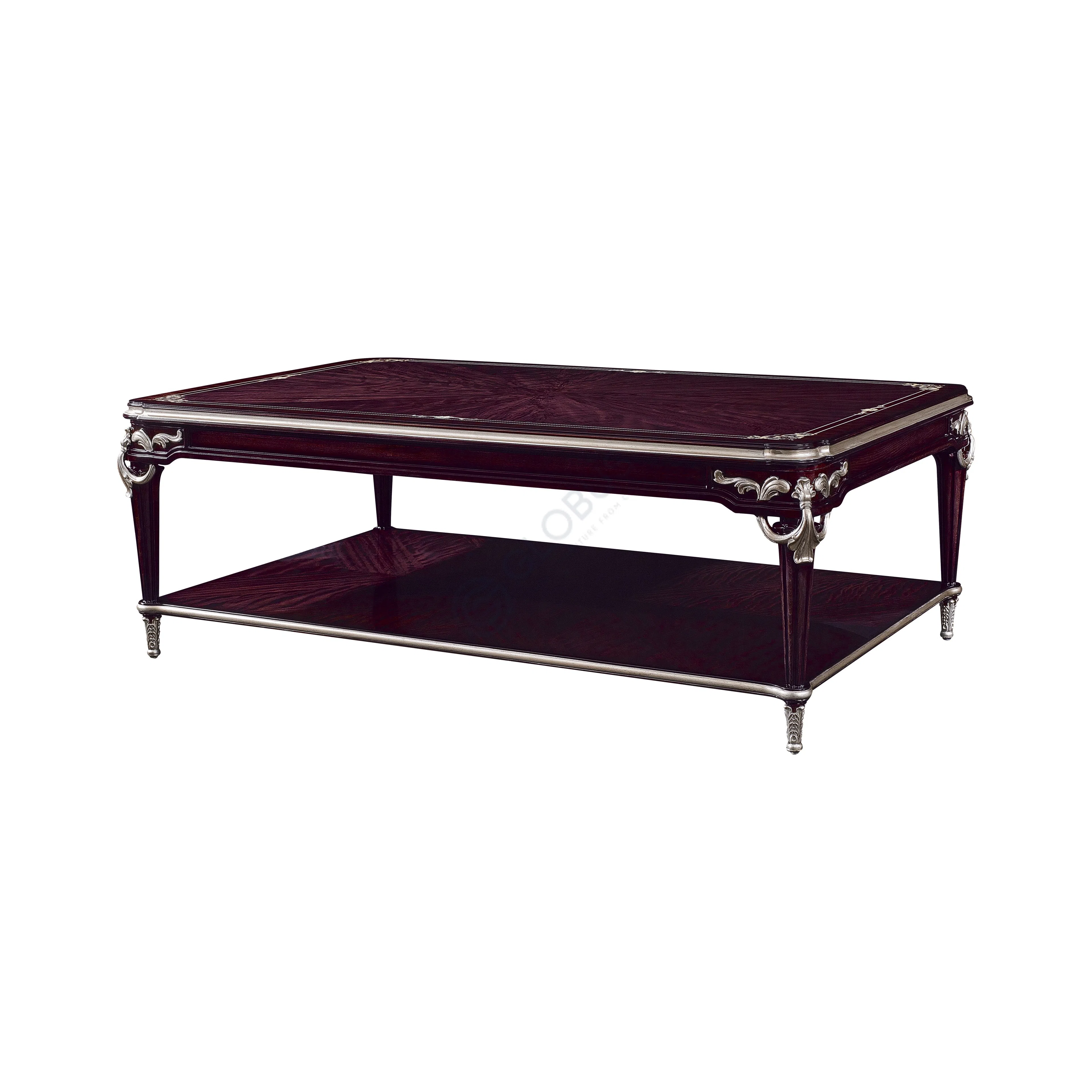 This elegant side table brings a touch of classic design to a living room. Its rich, deep wood tone provides a sophisticated foundation, complemented by intricate silver detailing that highlights the edges and joinery. The tapered legs feature subtle carved accents and coordinating silver feet, enhancing its refined appearance.