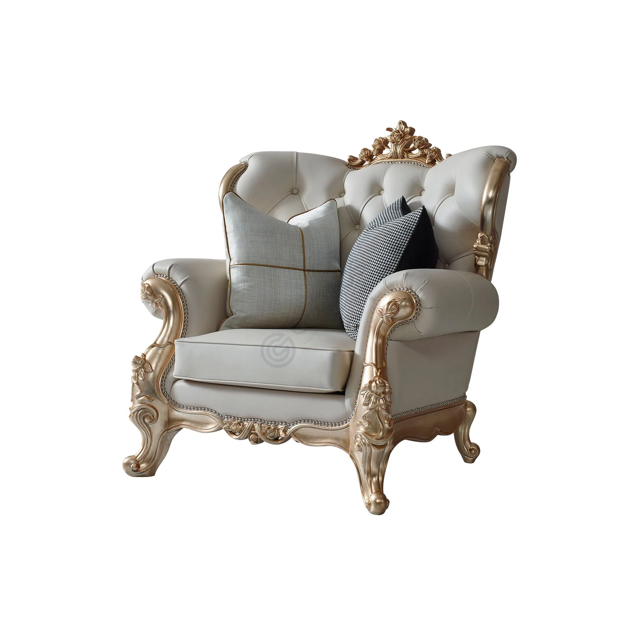 The design is distinguished by elegant tufting across the backrest and gracefully rolled arms. Plump cushions sit atop the main seat, promising comfort, while the intricate handwork on the wooden elements, from the legs to the cresting rail, highlights meticulous craftsmanship. These decorative details create a harmonious balance with the smooth leather surfaces.