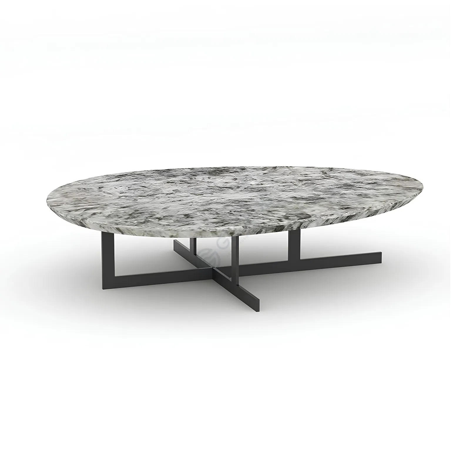 The round tabletop, made of natural marble, showcases unique patterns and fine texture, adding a refined and timeless touch. Its smooth, durable surface complements the industrial-style base, creating a balanced and harmonious look.