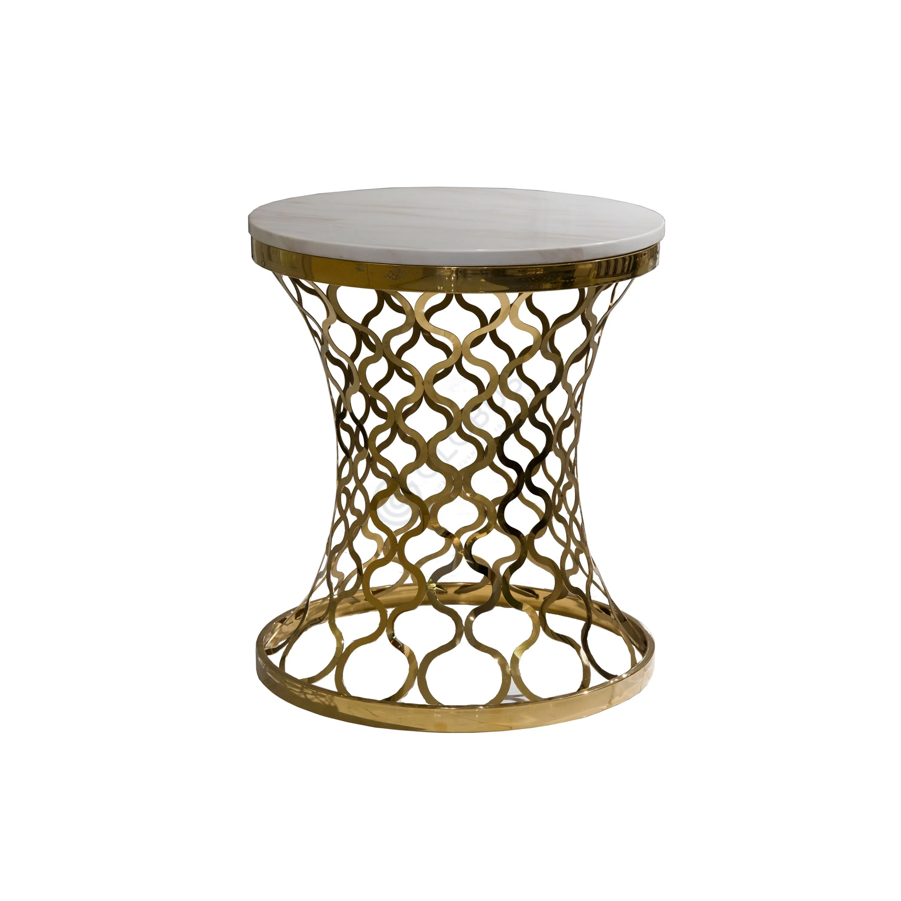 Beneath the marble top sits a distinctive metal base. Crafted with an intricate openwork pattern from metal, it features a warm, golden-toned finish. The curved lattice design offers visual interest and a sense of lightness while providing stable support.
