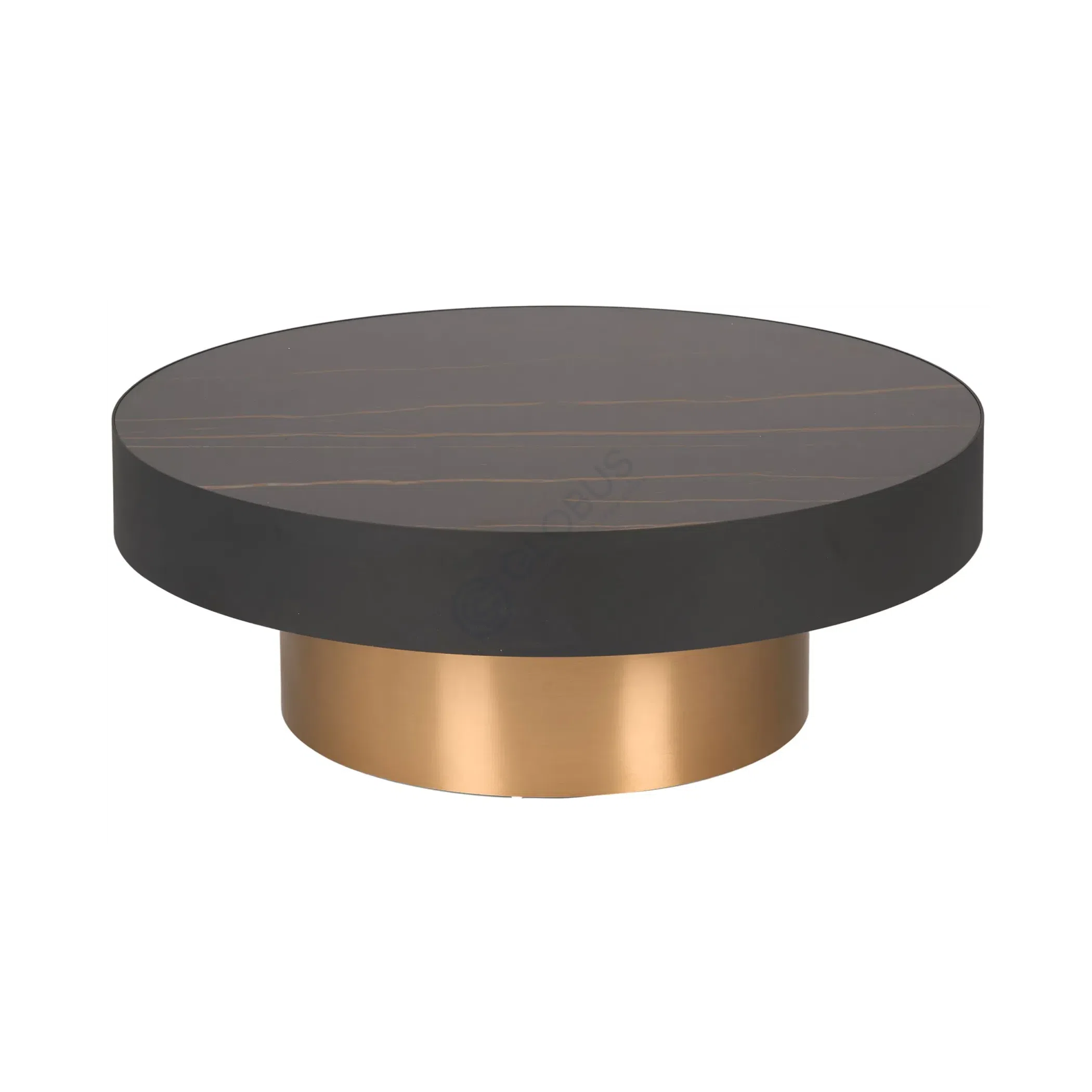 The table features a circular top crafted from durable sintered stone, presenting a beautiful dark surface with unique, subtle veining. This material offers resilience and a luxurious appearance. Supporting the top is a substantial cylindrical base made from polished stainless steel, finished in a radiant golden tone that adds warmth and stability.