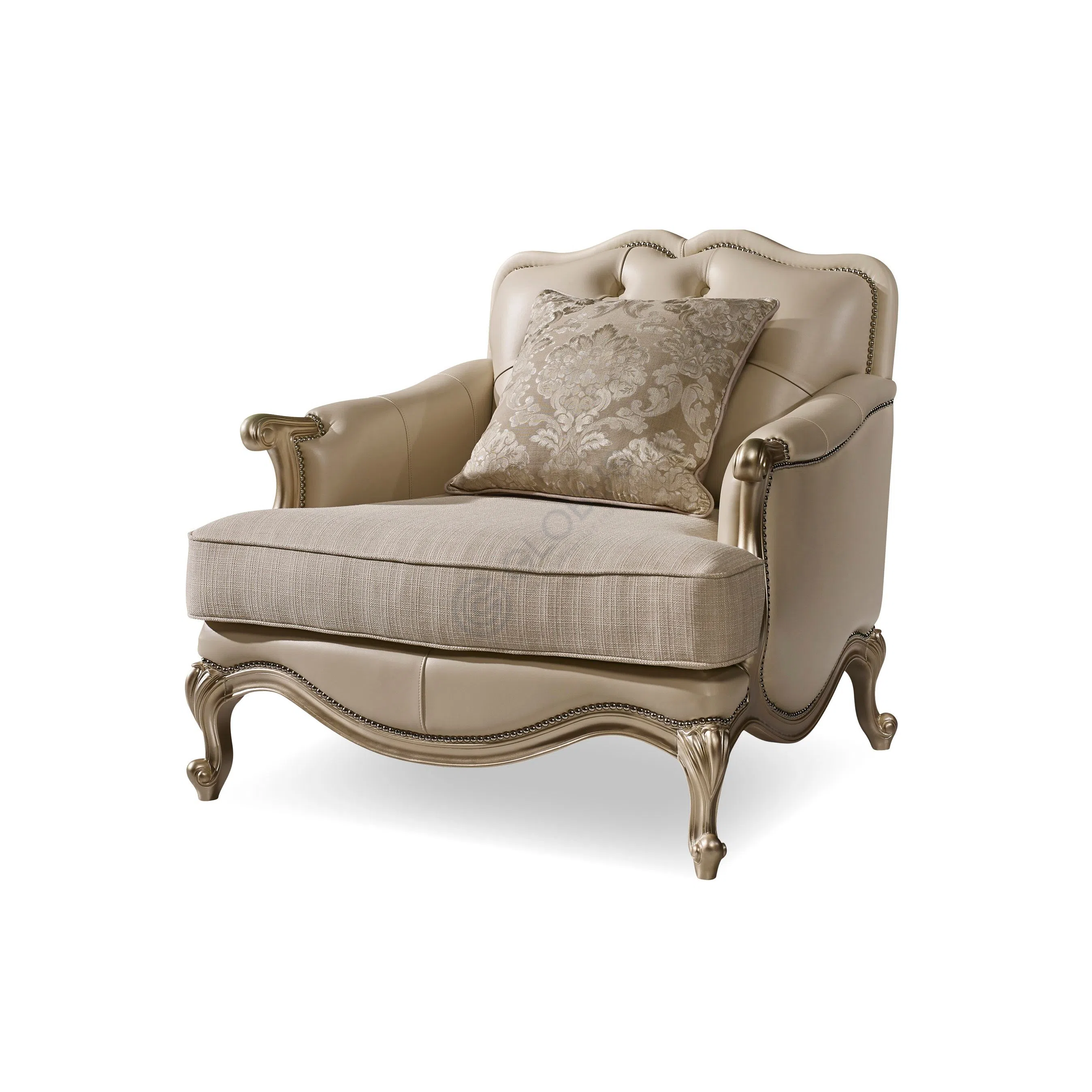 Upholstered in a soft, light-colored textile, the sofa offers a welcoming texture. Button tufting on the back adds a touch of traditional craftsmanship, while the accompanying throw pillows provide layers of texture and complementary color. The base of the sofa is adorned with intricate wood carvings, finished in a subtle antique tone, enhancing its classic appeal.
