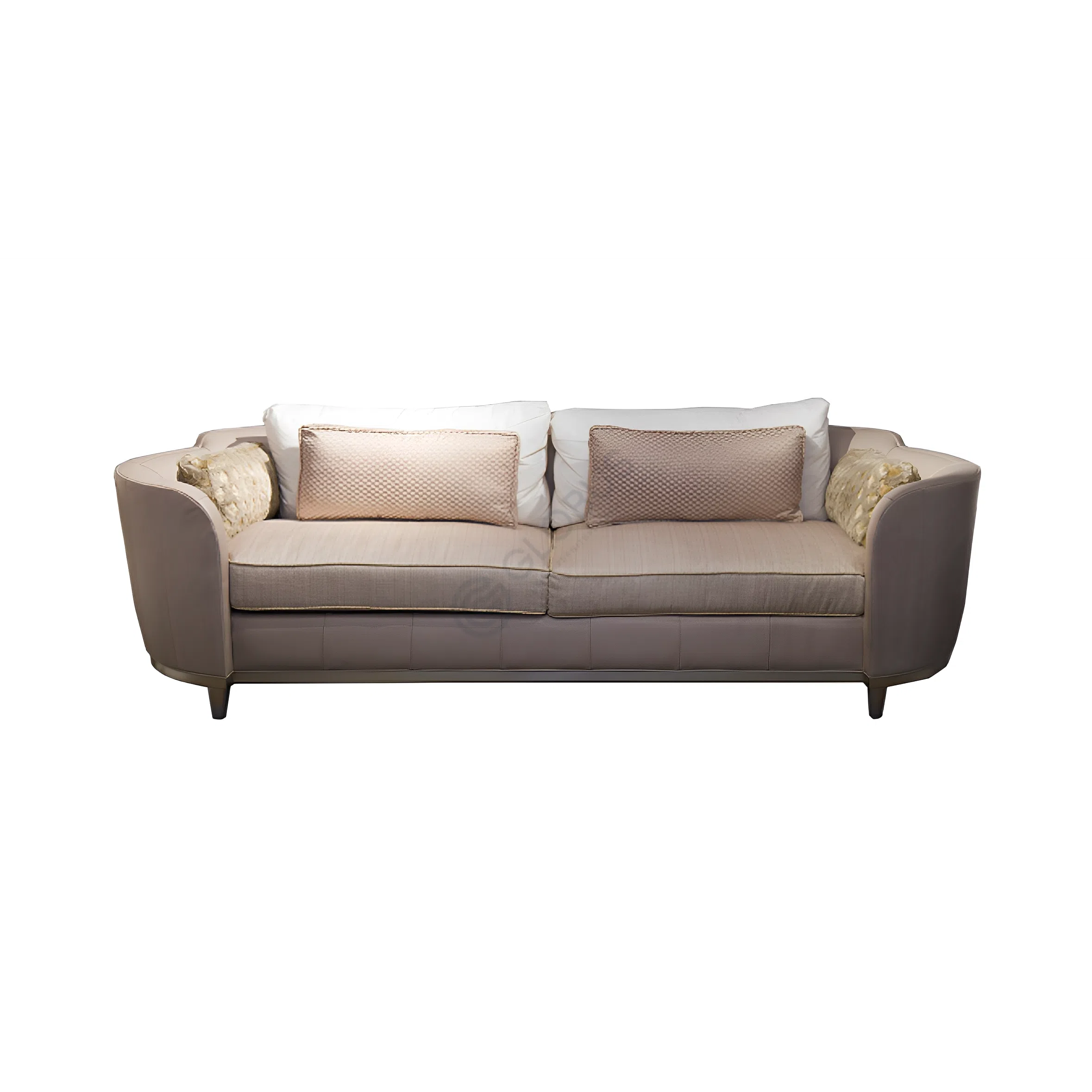 Crafted with attention to quality, the frame combines solid wood and plywood for robust support. The seating and back are upholstered in a luxurious textile, complemented by a smooth microfiber leather on the exterior. This combination provides both a soft touch and enduring elegance. Plush cushions enhance the seating experience and add textural interest.