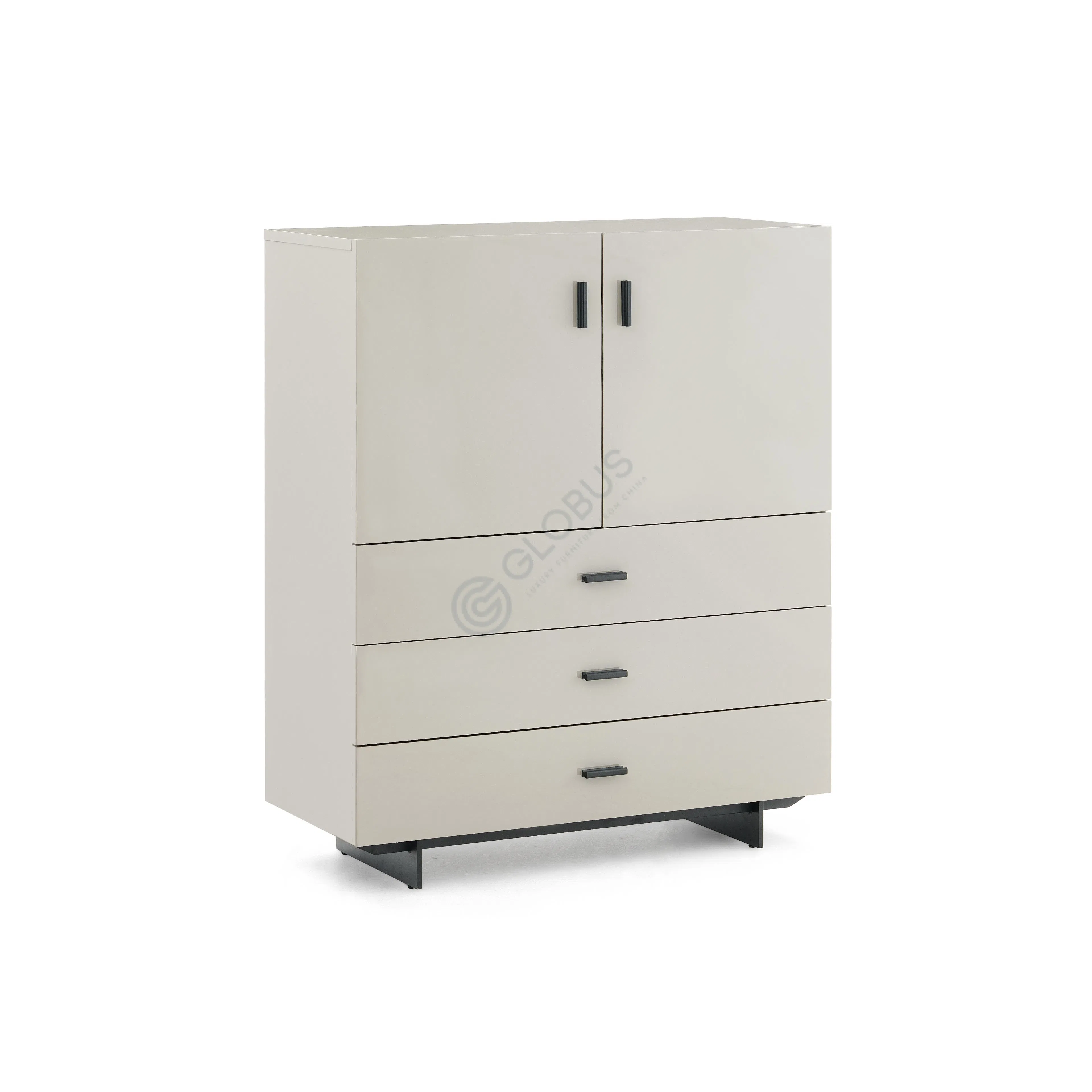 Constructed from high-quality solid wood, natural veneer, and durable MDF, this piece provides sturdiness while maintaining a refined aesthetic. The neutral tones of the cabinetry, paired with the minimalist black handles, make it adaptable to various interior styles.
