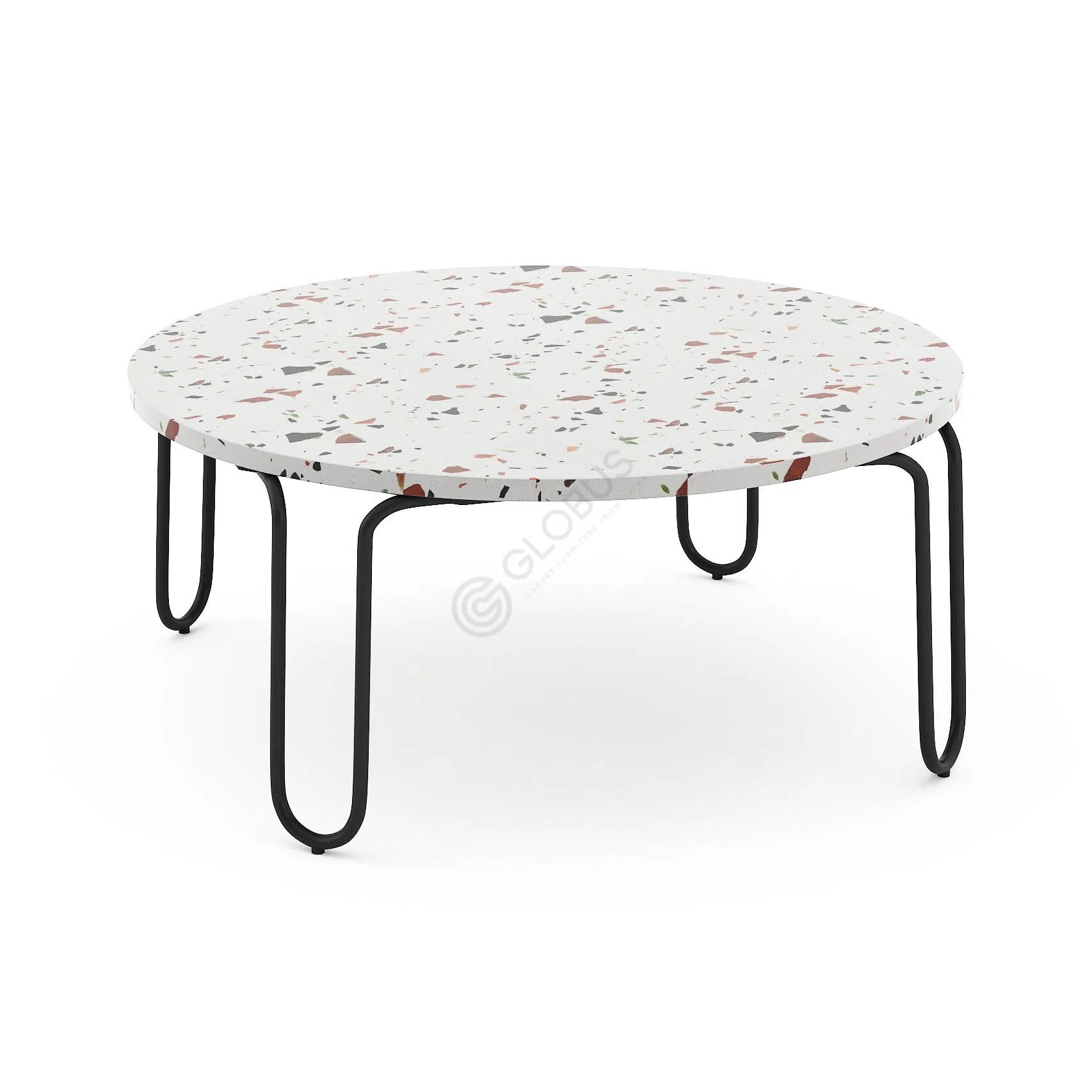 This modern side table seamlessly combines style and functionality, making it a perfect addition to any living room. Its round terrazzo surface offers a sleek, durable top, with flecks of color adding subtle character and charm to its design.