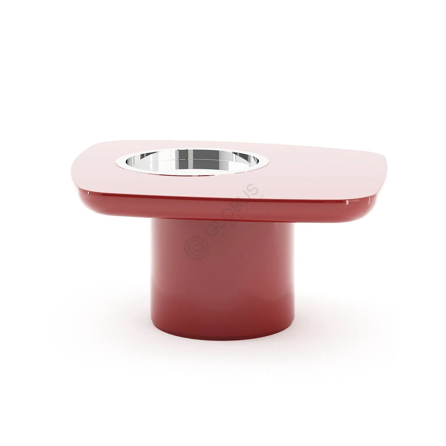 The table's rounded edges and innovative geometric form enhance the overall aesthetic. The central recessed detail introduces visual interest and provides a subtle, stylish functionality. Designed for versatility, its neutral yet bold appearance integrates seamlessly into various modern interiors.