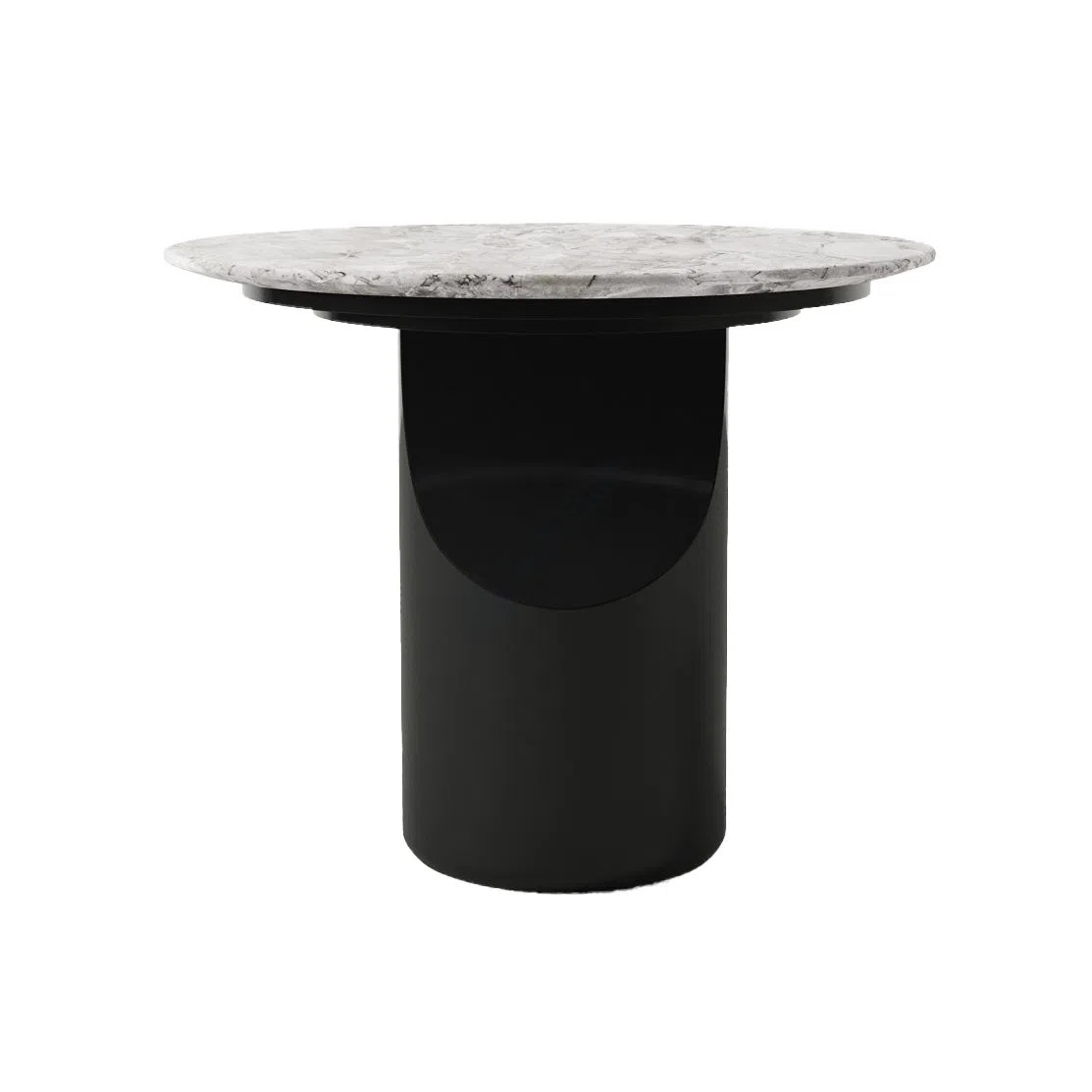 The base combines natural veneer, plywood, and MDF, forming a balanced design that is both sturdy and visually striking. The bold contrast between the sleek black base and the light marble surface creates a sophisticated look that complements modern interiors seamlessly.
