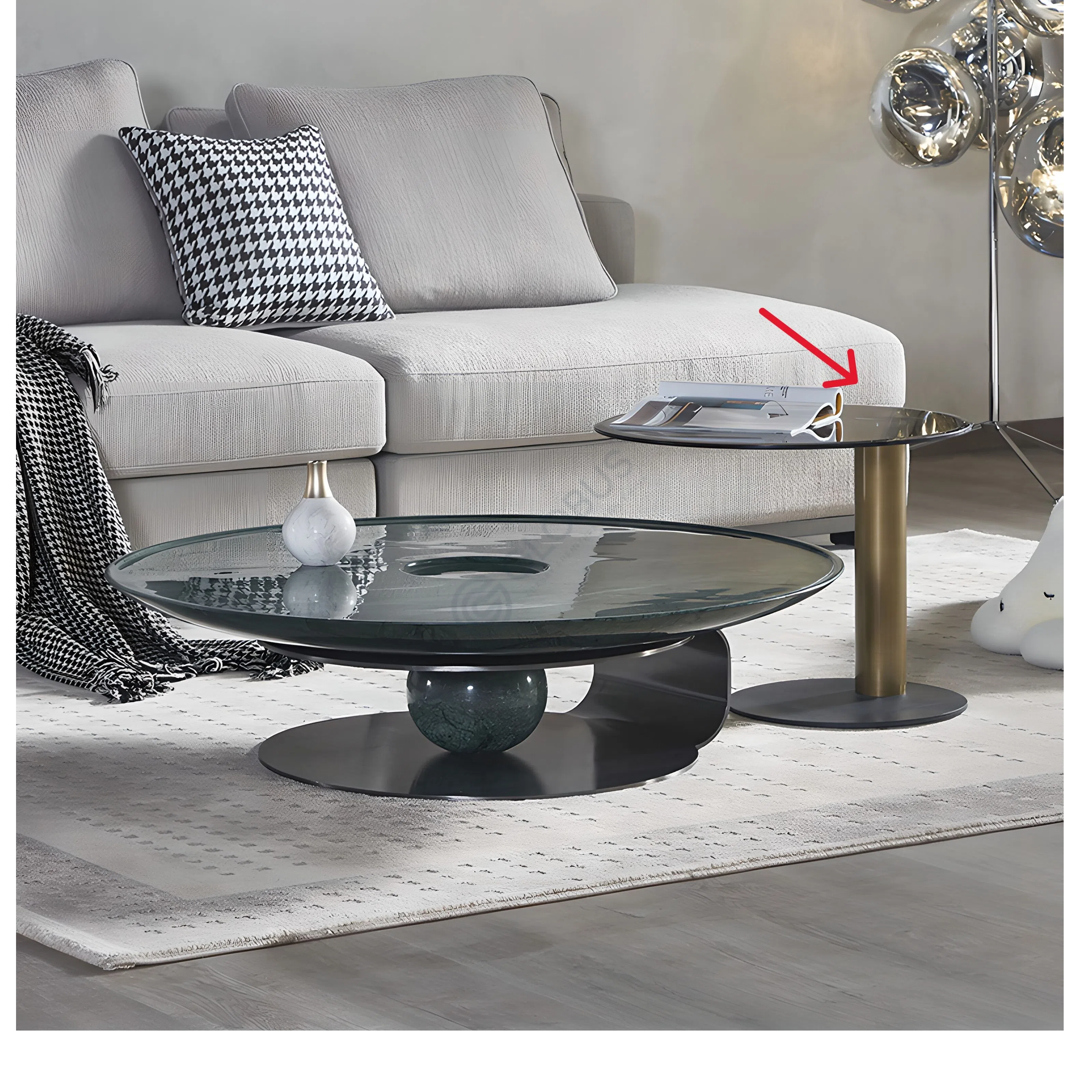 An elegant metal base provides stable support, designed with a sophisticated profile that enhances the table's modern aesthetic. This coffee table effortlessly elevates the style of a luxurious interior, offering both practical use and sculptural artistry.