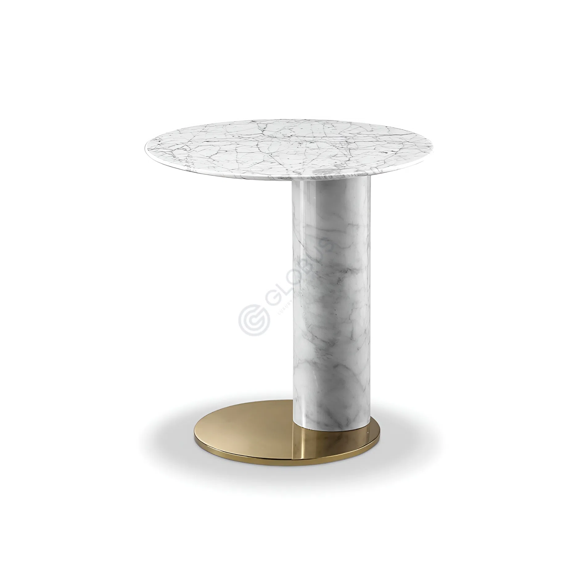 The table stands on a sturdy cylindrical base, also made from matching natural marble, offering a sense of solid elegance. This marble column rests upon a round, flat base plate made of polished stainless steel, finished in a warm brass tone that adds a touch of refined contrast and stability.