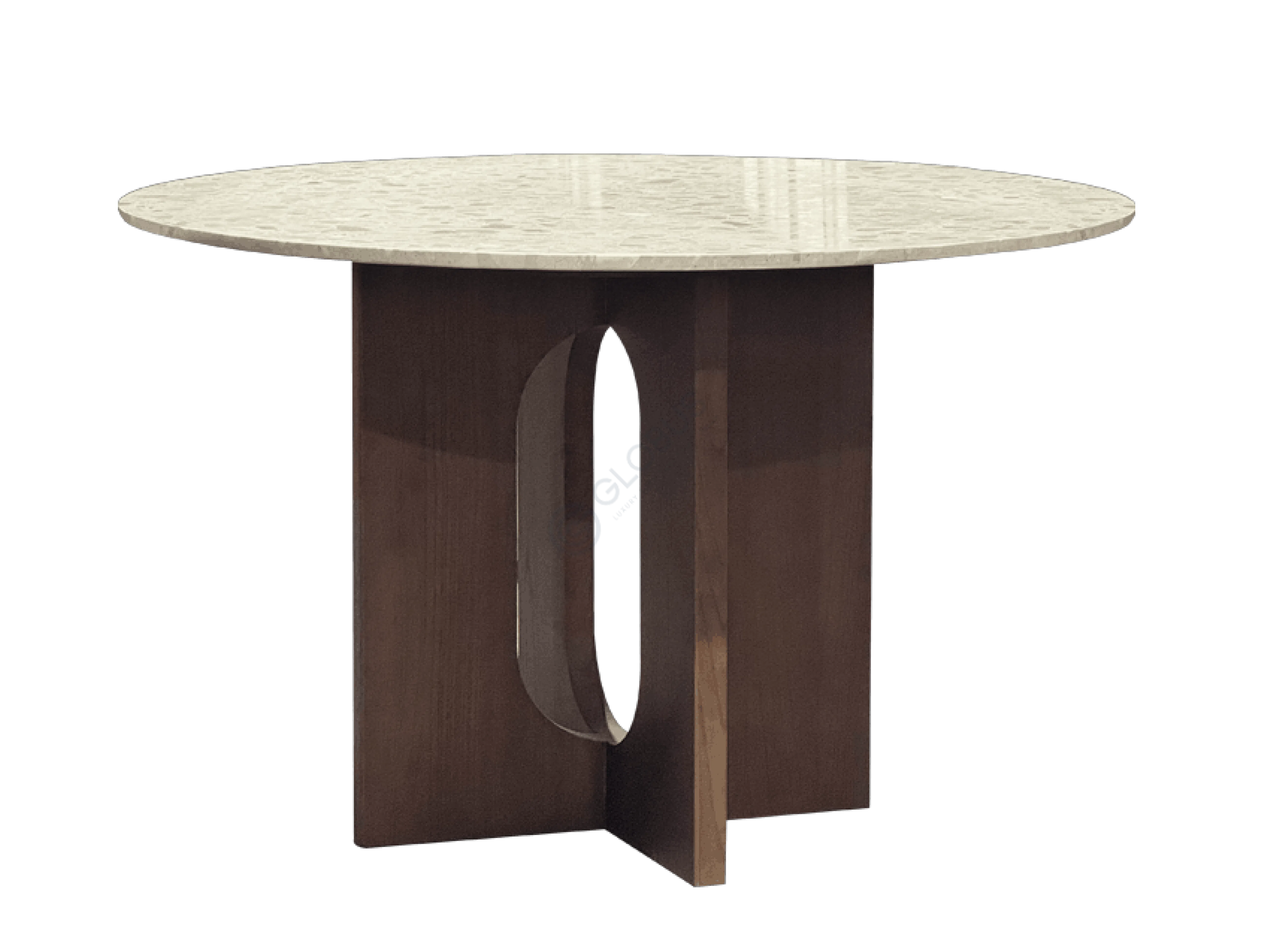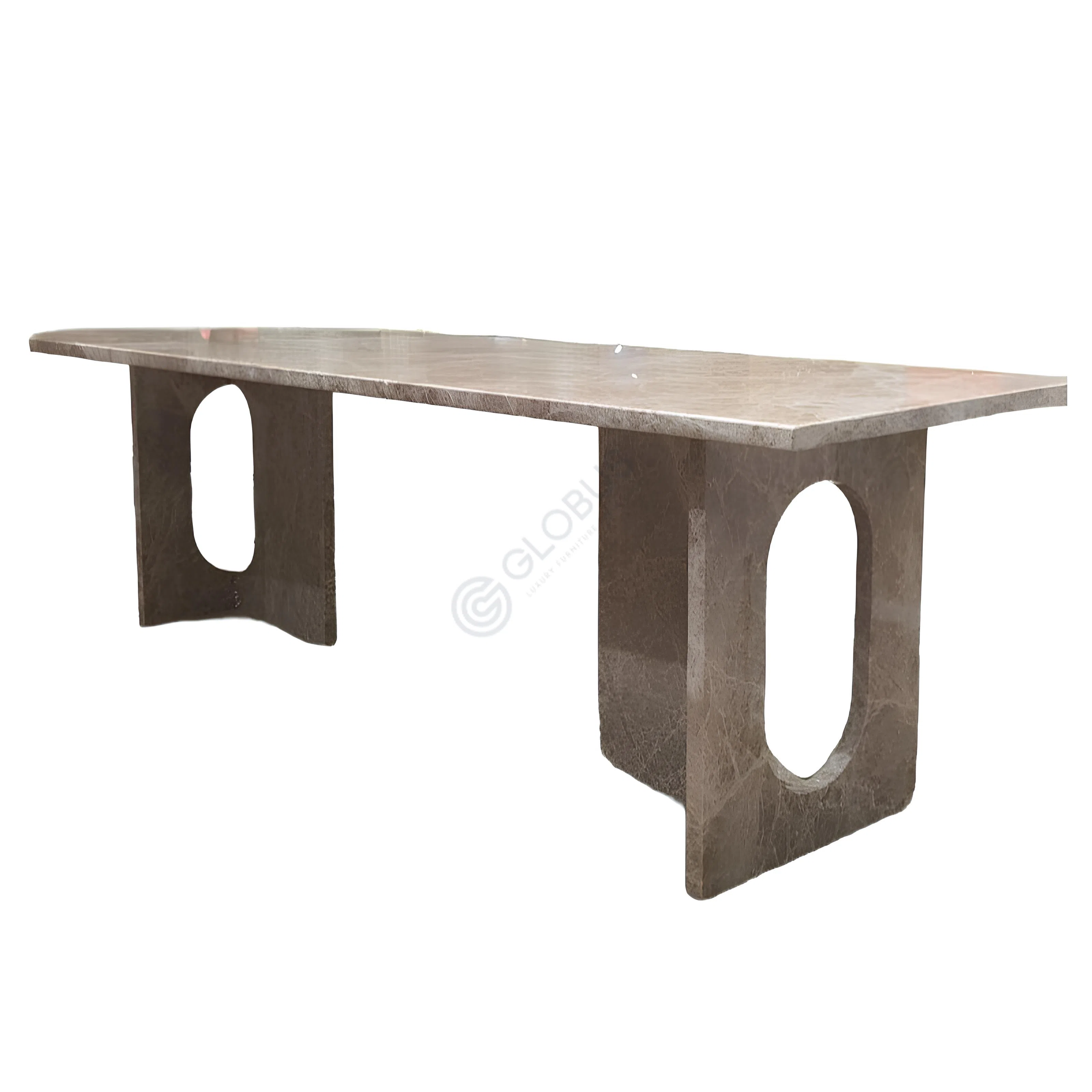A striking design element is the central vertical open channel that runs through the body of the table. This feature adds visual interest and a sense of lightness to the solid structure, creating a distinctive profile.