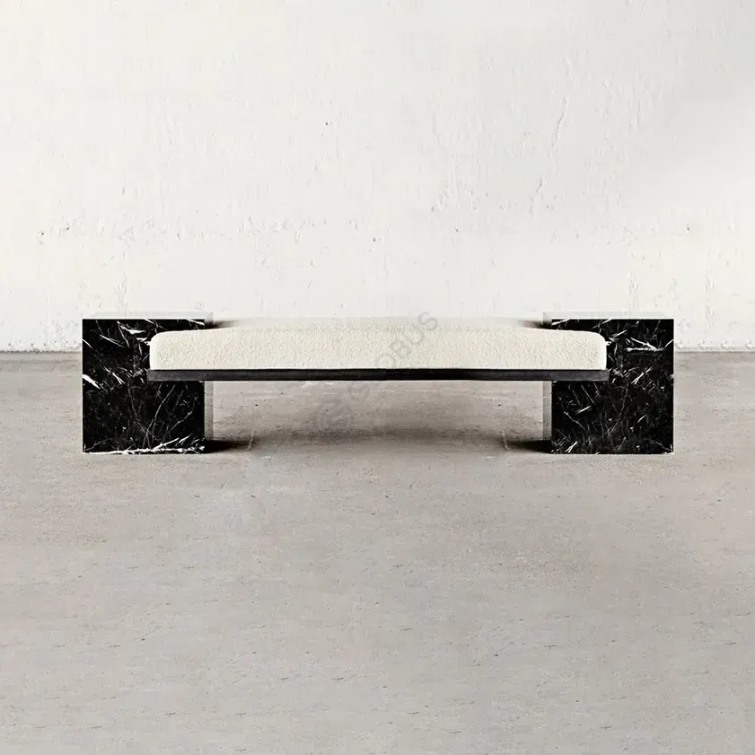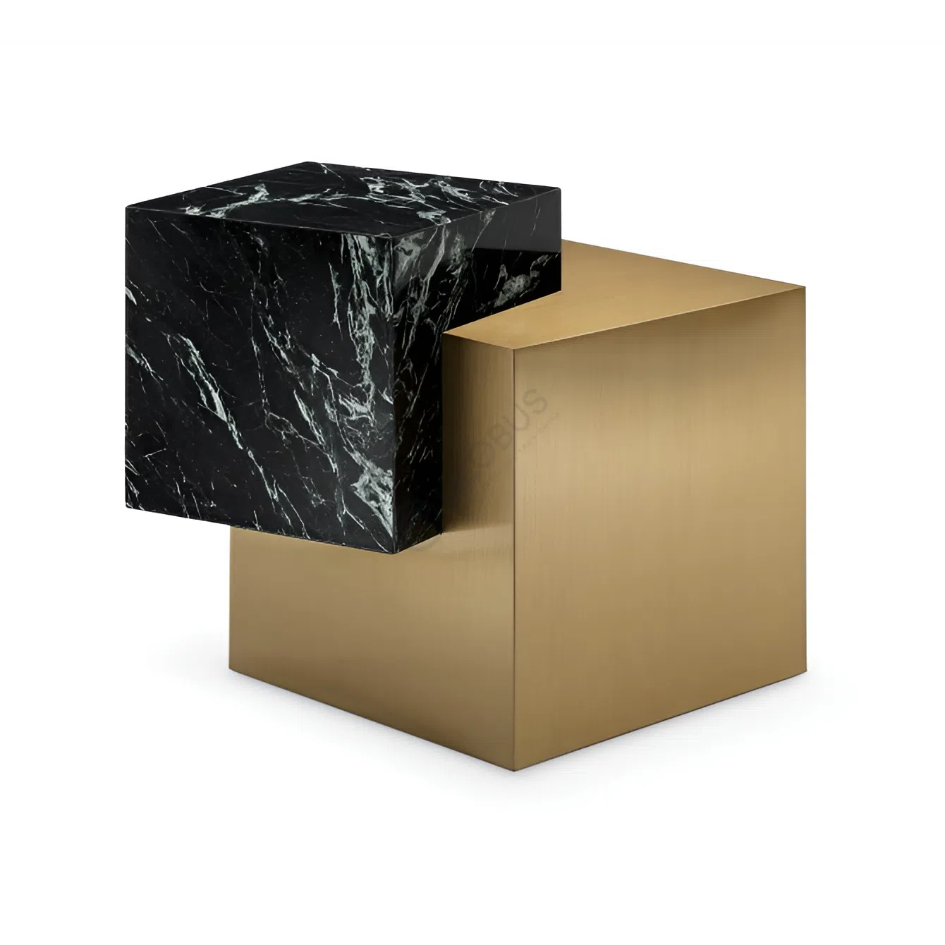 The base is made from natural marble, providing a solid foundation with unique patterns and tones inherent to the stone. A sleek stainless steel element connects the mirror panel seamlessly to the marble, adding a touch of refined detail to the design.