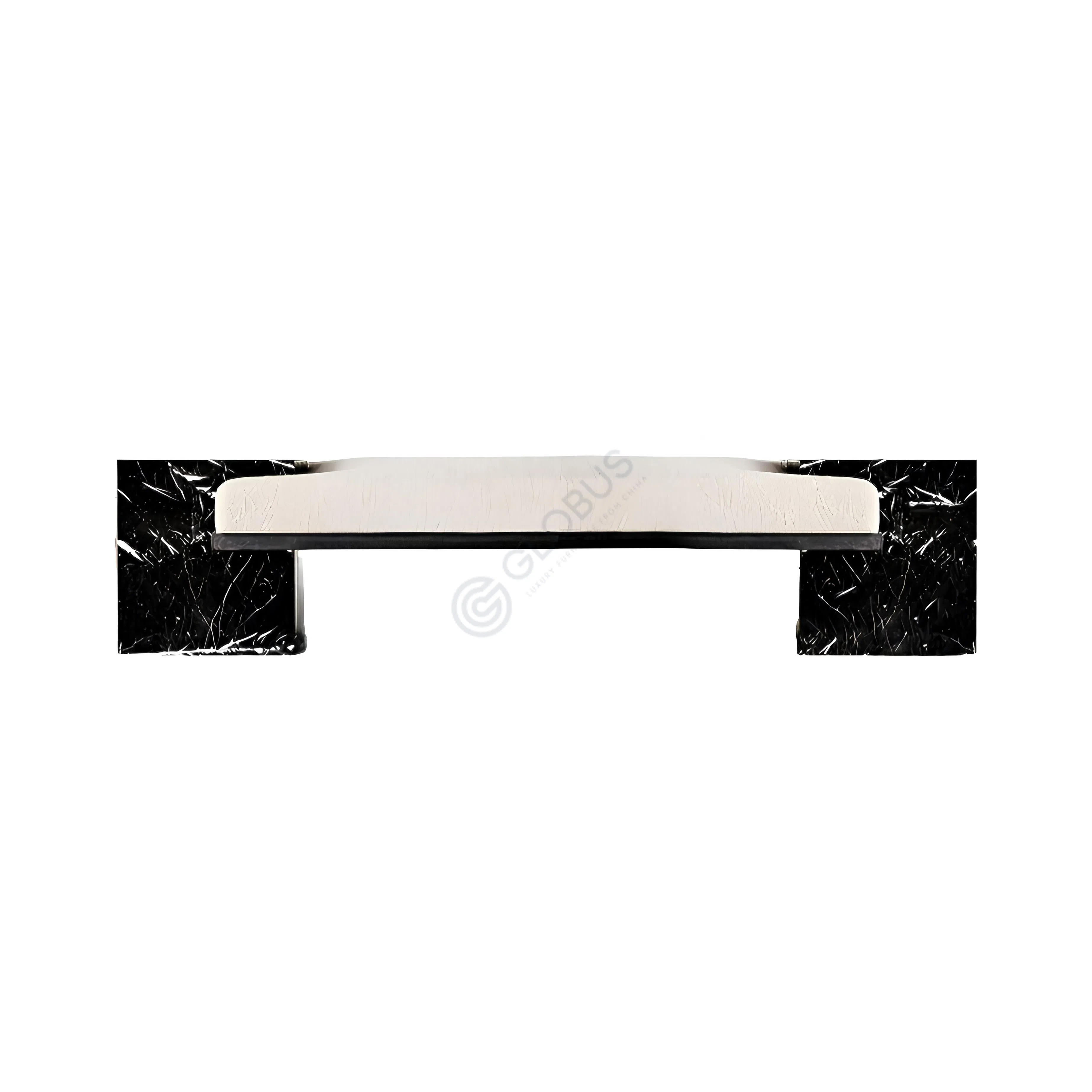 The base is made from natural marble, providing a solid foundation with unique patterns and tones inherent to the stone. A sleek stainless steel element connects the mirror panel seamlessly to the marble, adding a touch of refined detail to the design.