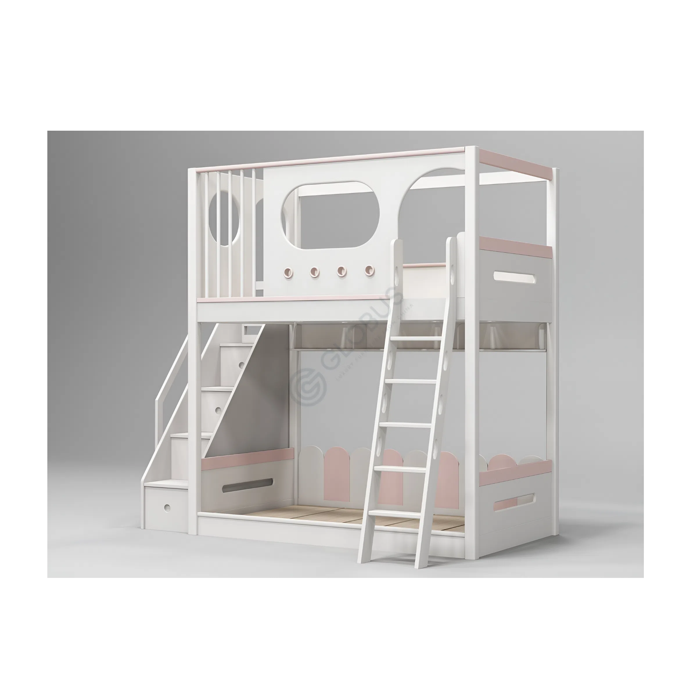 The thoughtful design incorporates both practicality and enjoyment. Access to the upper level is provided by a robust staircase that cleverly includes integrated storage drawers within each step, offering a discreet solution for organizing toys or clothes.