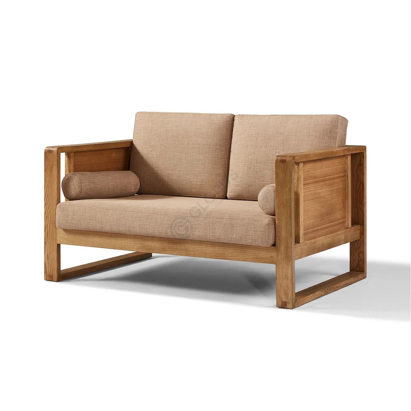 The seat and back cushions are covered in a natural textile, providing a soft contrast to the wood. Bolster cushions are fitted at the arms, enhancing both comfort and the chair's refined aesthetic.