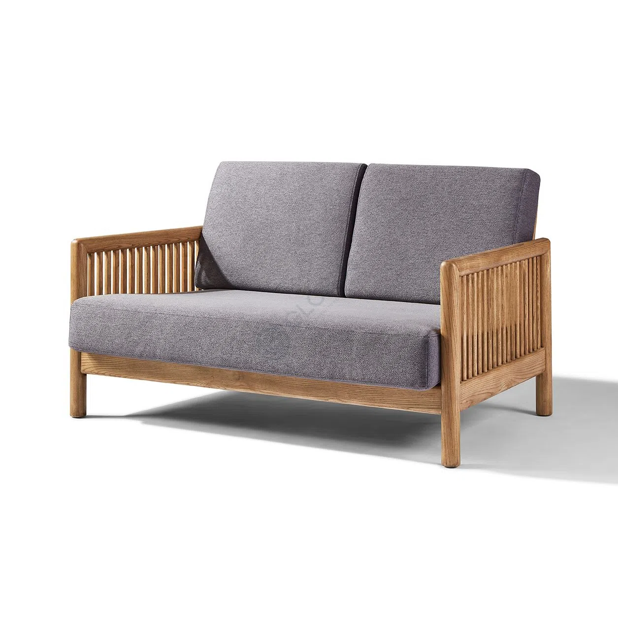 Constructed with a solid wood frame, the natural grain of the timber is beautifully highlighted. The distinctive slatted pattern on the arms adds a layer of refined detail and visual interest. Cushions are upholstered in a quality textile, providing a soft touch and understated elegance.