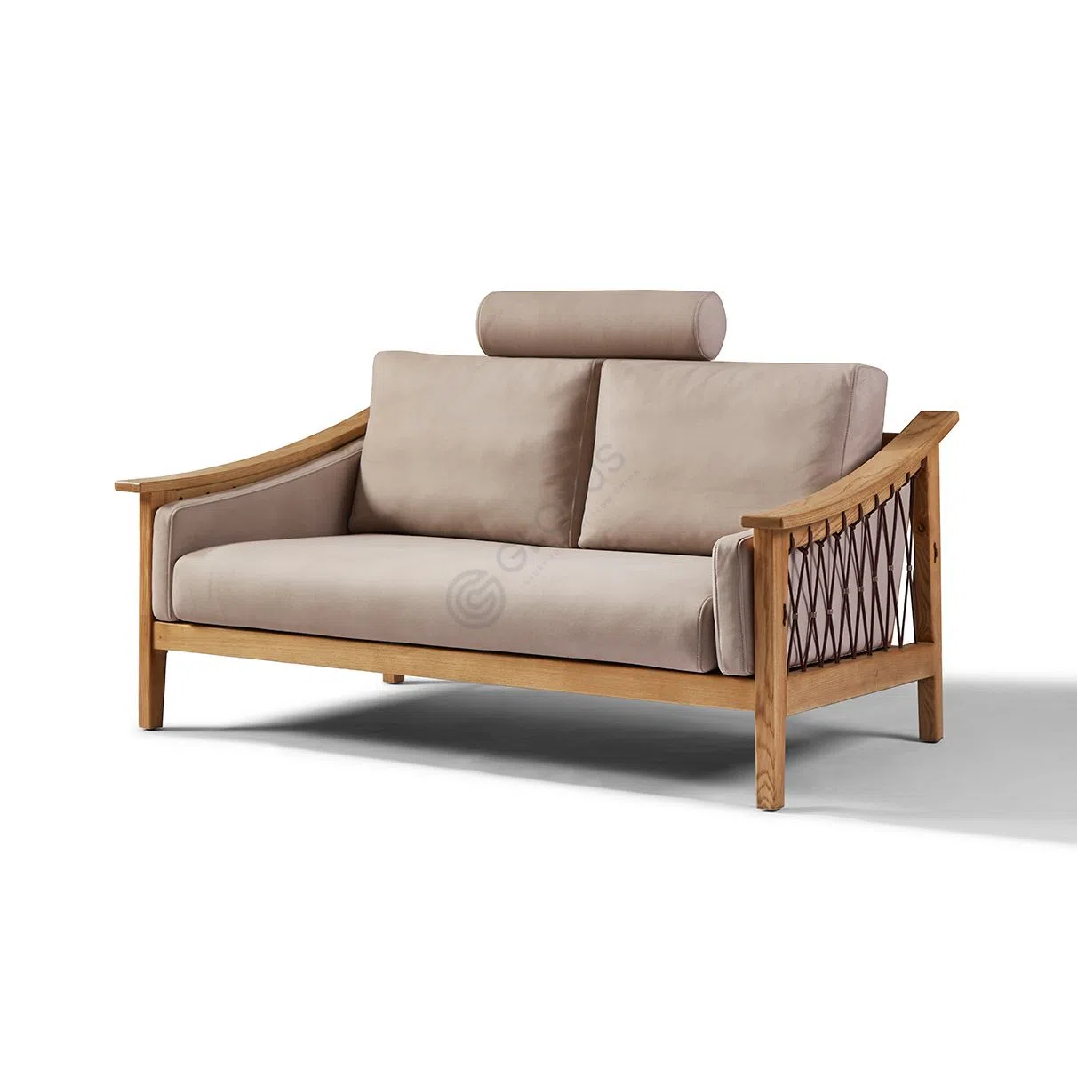 Complementing the solid structure are soft, inviting textile cushions for the seat and back, offering comfort and a refined aesthetic. This piece embodies a modern, eco-conscious sensibility with subtle Asian-inspired details, providing a comfortable and stylish seating option perfect for creating a tranquil retreat within a living room setting.