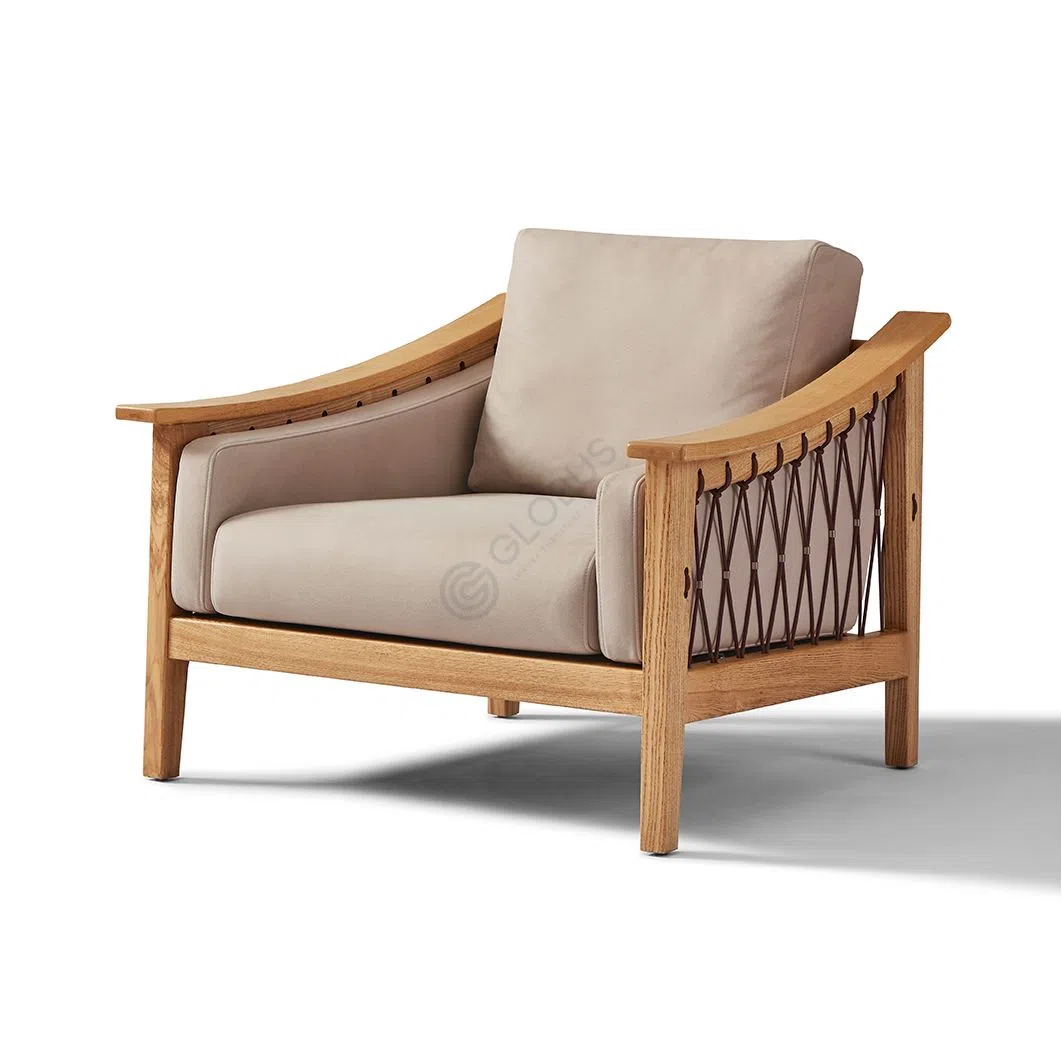 The solid wood frame reveals the inherent beauty of the material through its visible grain and smooth finish. Elegant curved armrests provide a gentle line, complemented by an intricate woven detail on the side panels that adds a unique touch inspired by traditional craftsmanship. This combination speaks to an appreciation for natural form and detail.