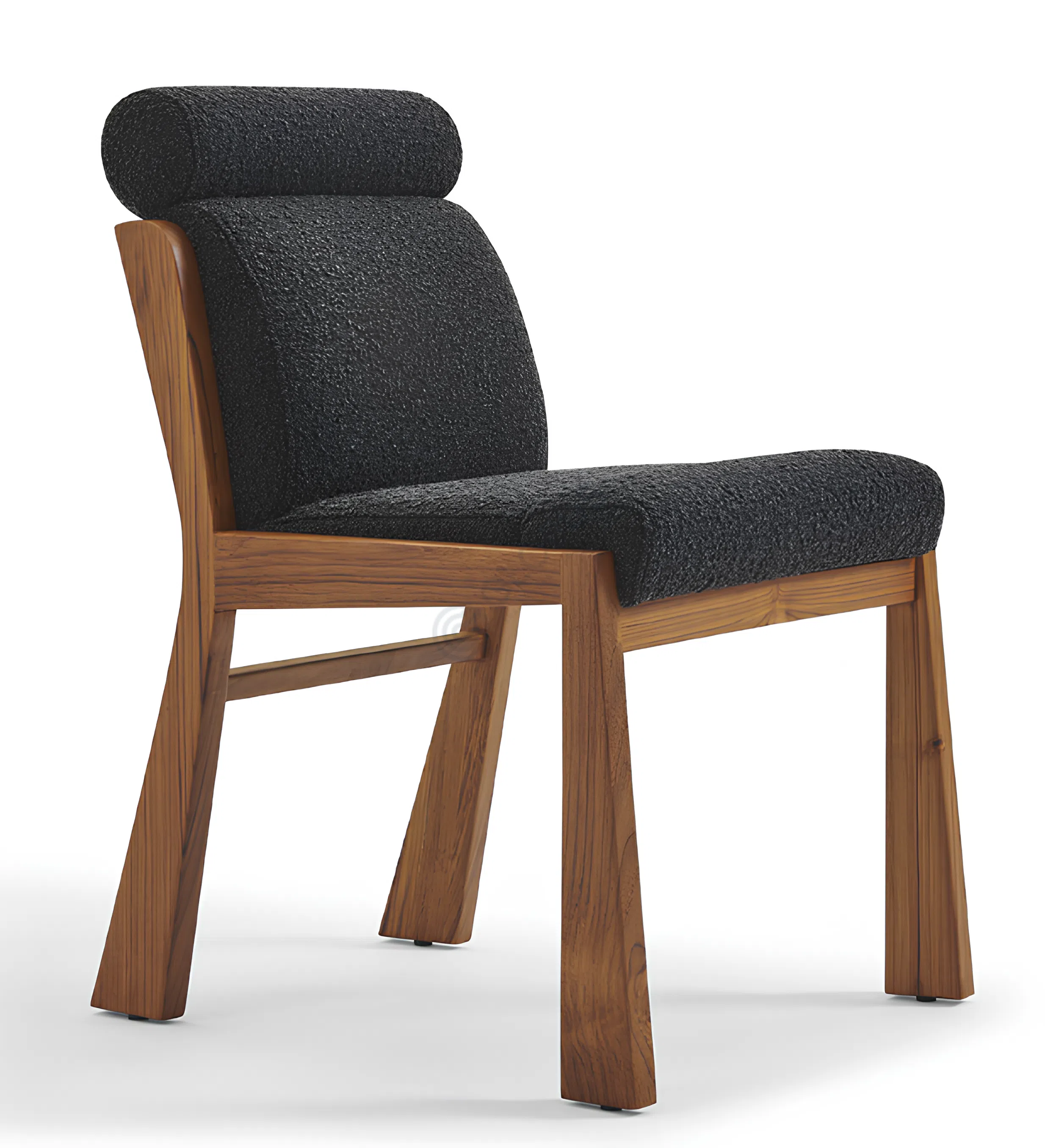 The generously padded seat and backrest offer supportive comfort, covered in a rich fabric that provides a pleasant tactile experience. A distinctive bolster at the top of the backrest is thoughtfully designed to provide additional relaxation. Subtle armrests are integrated into the wooden structure, offering gentle support without interrupting the chair's sleek profile.