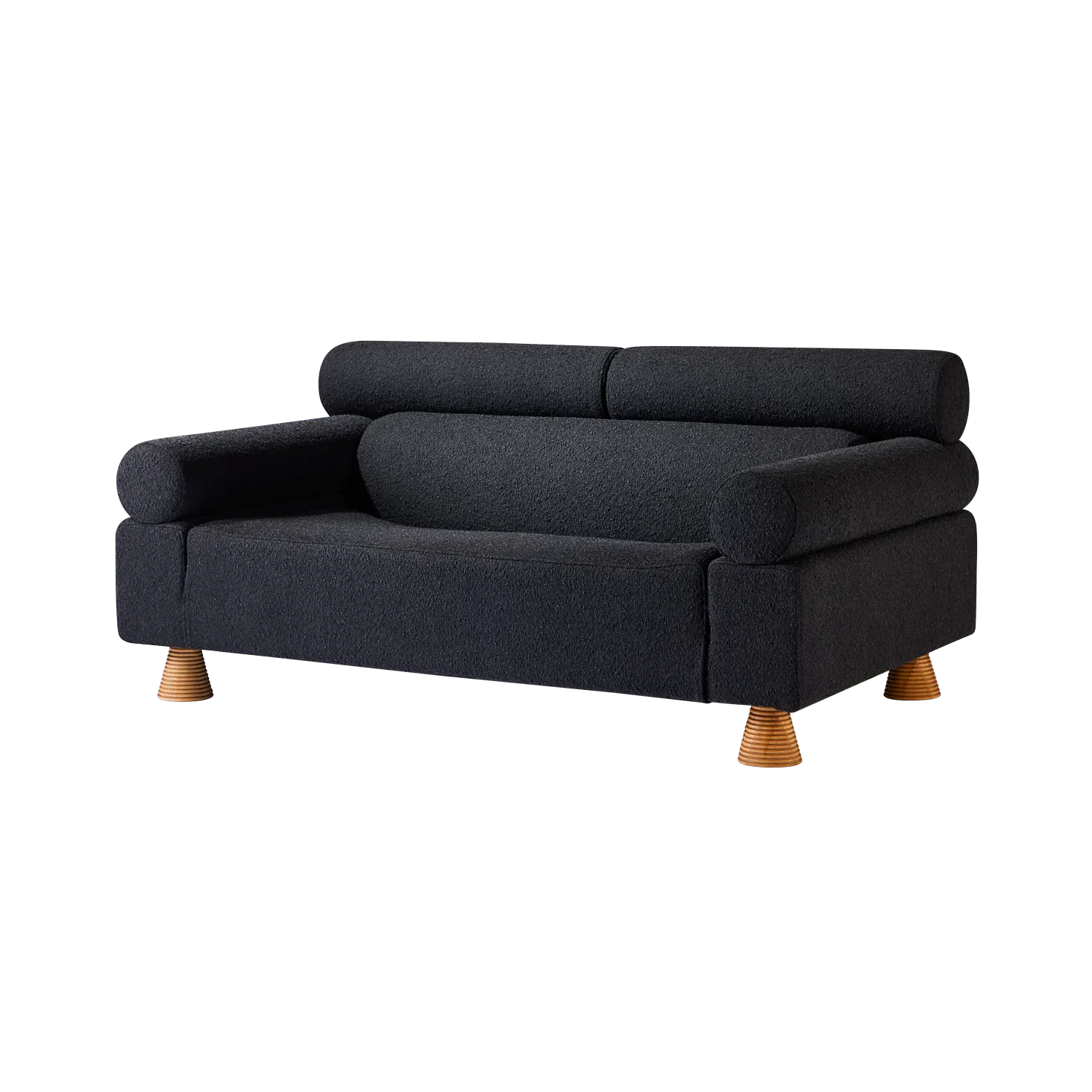 Supporting the substantial form are unique legs crafted from solid wood, featuring a distinctive ribbed pattern. This detail subtly introduces an Asian-inspired element, creating a fascinating fusion of modern lines and artisanal touches. It serves as a distinctive focal point or a comfortable seating addition within a living room setting.