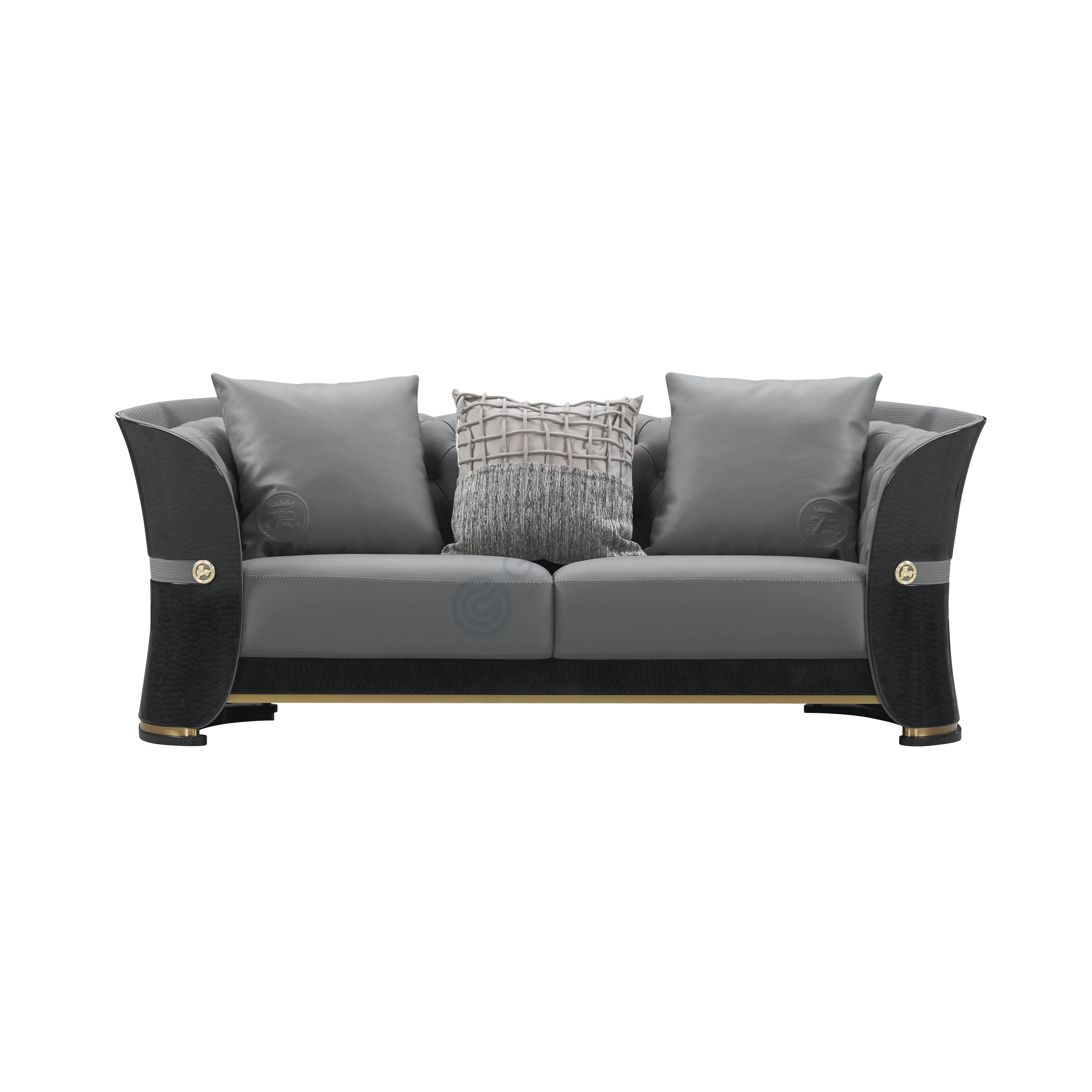 Crafted with a solid wood frame for enduring stability, the bed is beautifully upholstered. The headboard features deep tufting, adding a touch of classic elegance to the contemporary shape. Upholstered in a choice of fine leather or soft microfiber leather, the bed frame extends this premium finish, ensuring a cohesive and opulent look. Sleek metal accents at the base provide a modern contrast and elevated style.