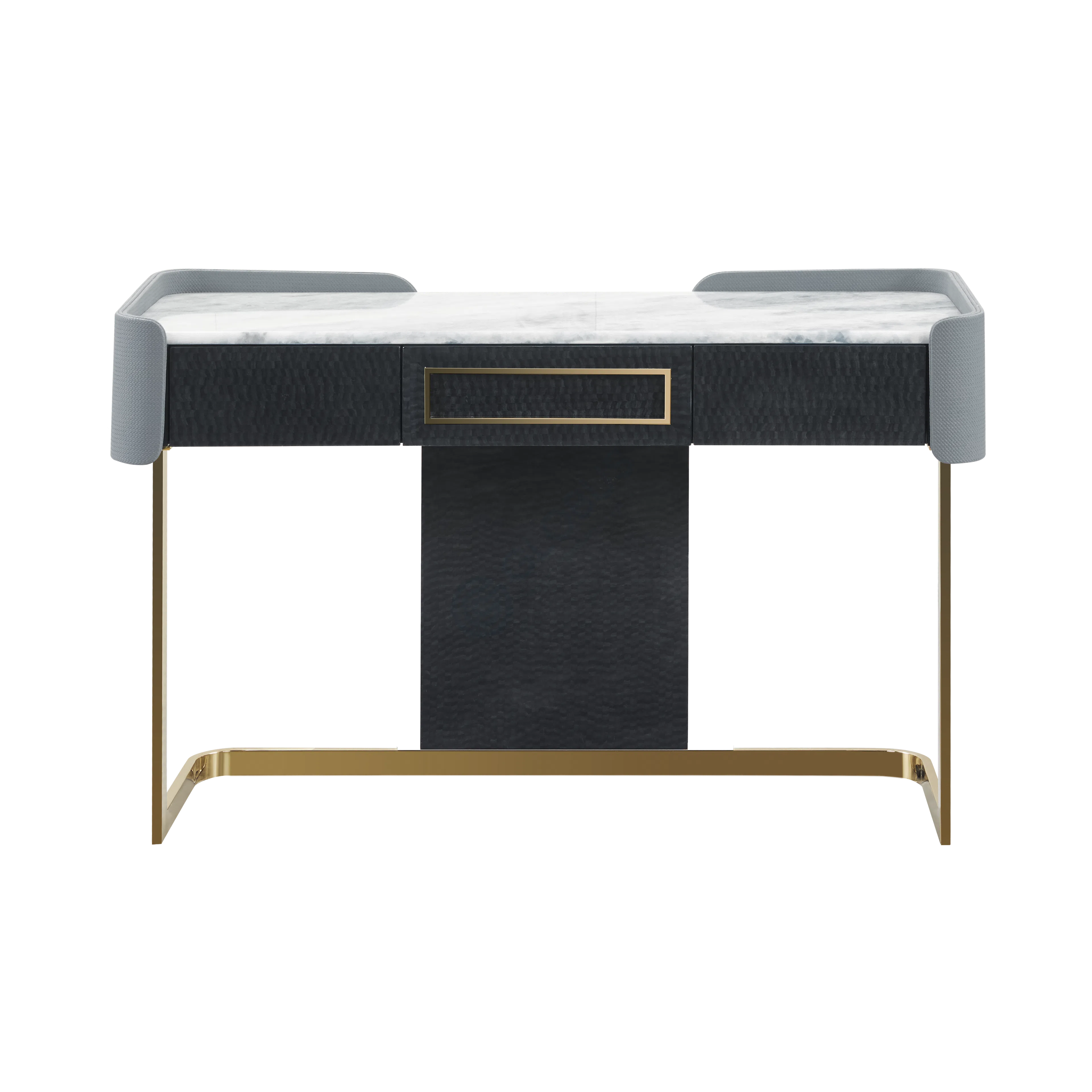 Crafted with a solid wood structure, this table is topped with a slab of natural marble, showcasing unique veining patterns that ensure no two pieces are exactly alike. The sides are elegantly wrapped in microfiber leather, offering a soft, tactile contrast to the hard surfaces. Supporting the body are distinctive metal legs, finished in a warm tone that complements the overall palette and adds a touch of refinement.