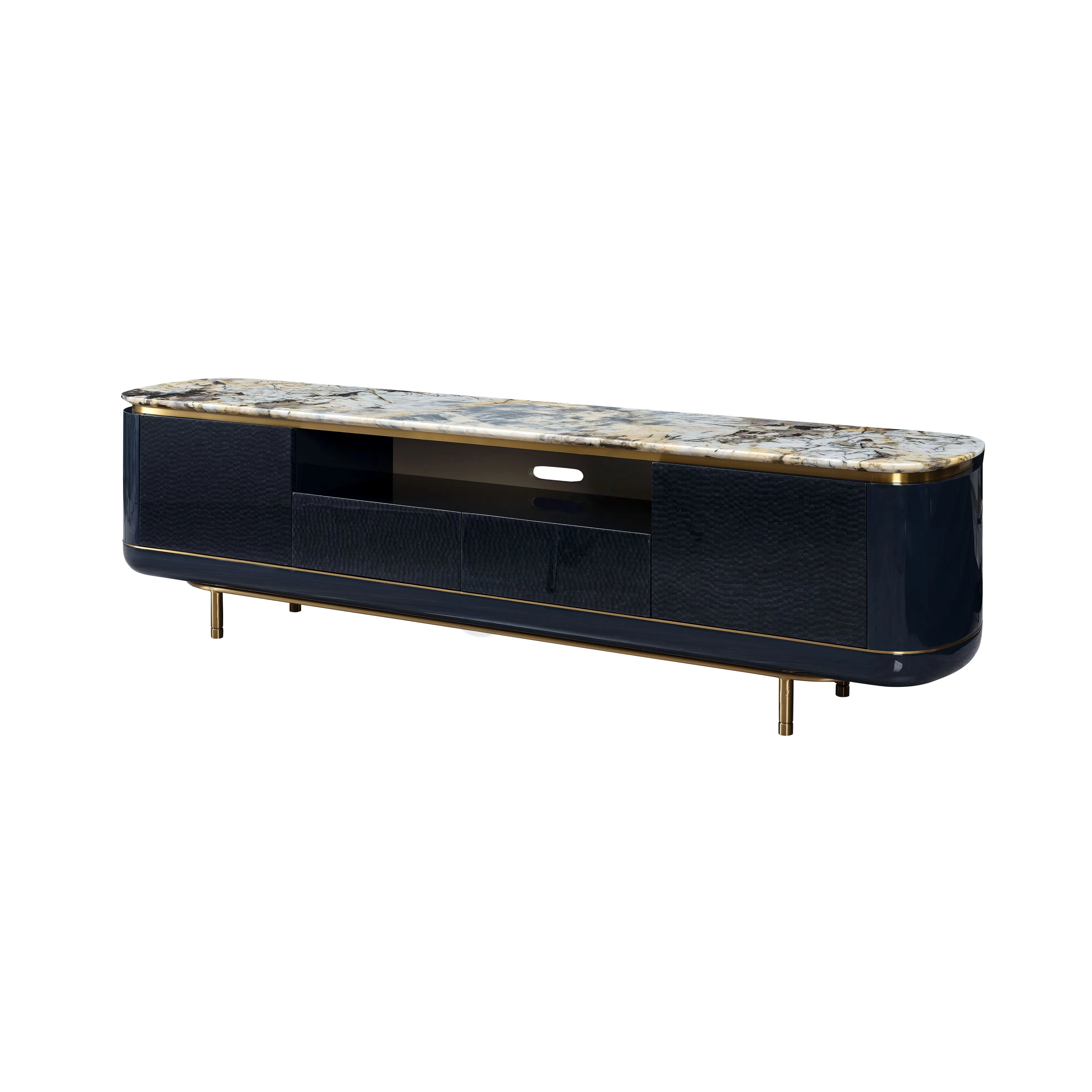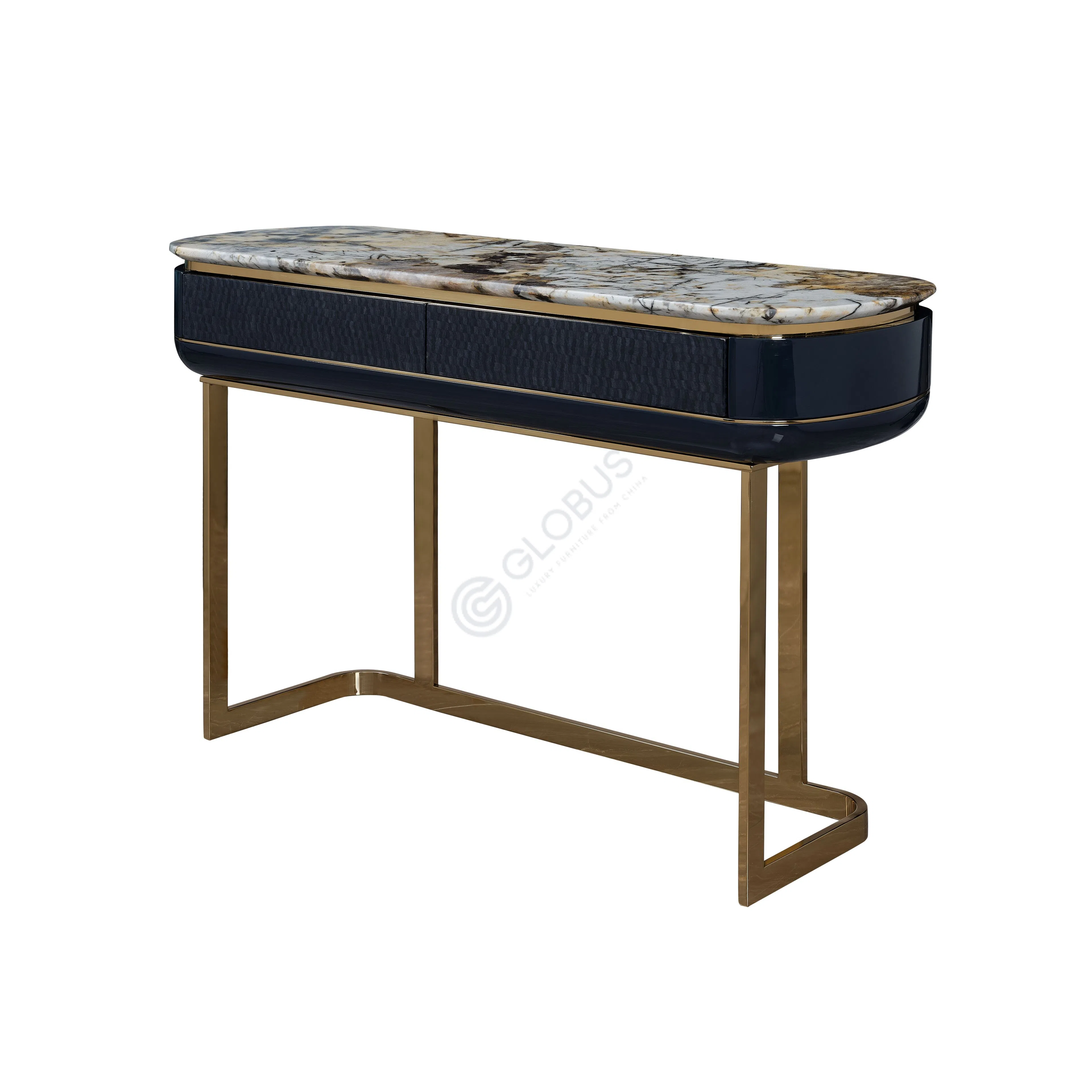 Beneath the display area, the cabinet includes discreet storage drawers. These are finished with a sophisticated texture, adding a layer of visual interest and tactile appeal. The drawers provide practical, concealed space for accessories, linens, or other items.