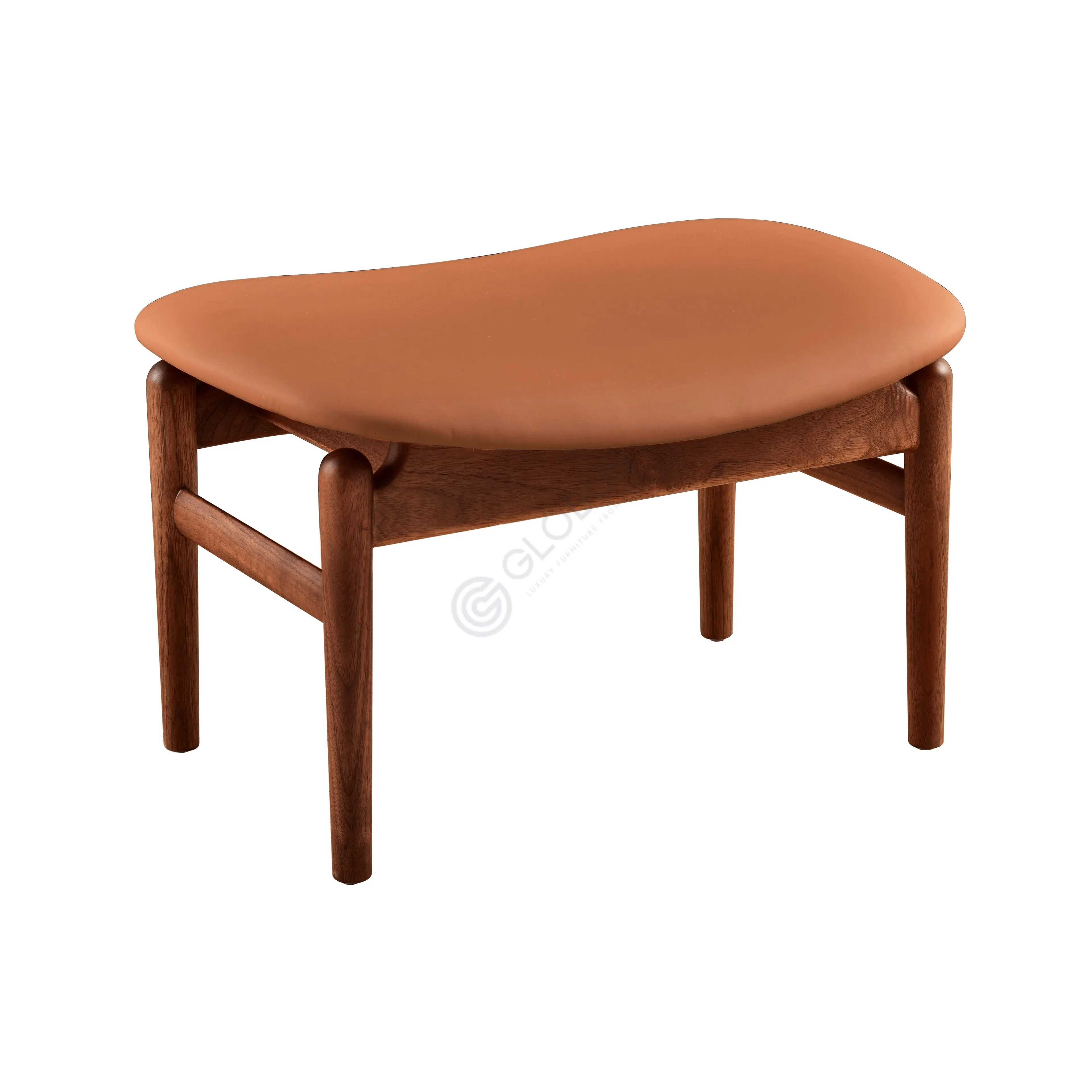 The foundation is expertly crafted from solid wood with a deep, dark finish that accentuates its clean lines and elegant joinery. This sturdy, geometric structure provides a compelling contrast to the organic curves of the seat shell. The seat and back are upholstered in a smooth, caramel-colored textile, with delicate button tufting on the backrest that adds a refined, textural detail to the minimalist form.