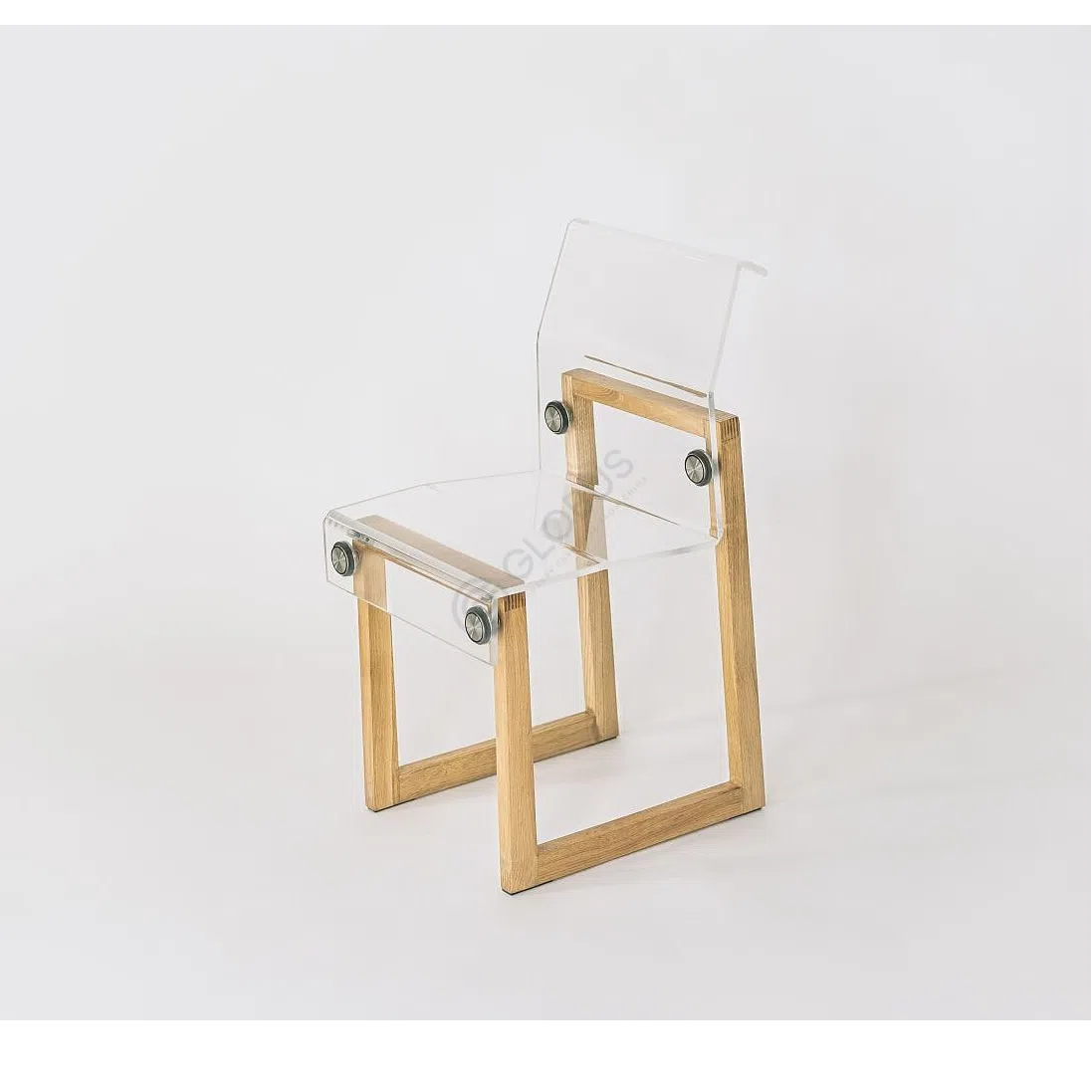The clear acrylic elements allow light to pass through, creating a sense of openness and highlighting the structural beauty of the wooden frame. The exposed connections and clean lines underscore its modern, architectural style, turning functionality into a visual statement.