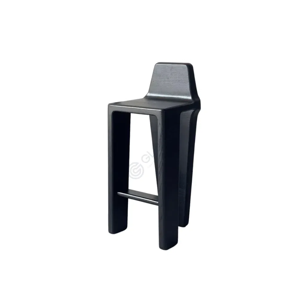 This dining chair features a distinctly modern silhouette, defined by its robust, sculptural form. The design presents clean, angular lines combined with subtly rounded edges, creating a look that is both strong and refined. Its unique structure, with thick, solid legs and a low backrest, gives the piece a grounded and contemporary presence.