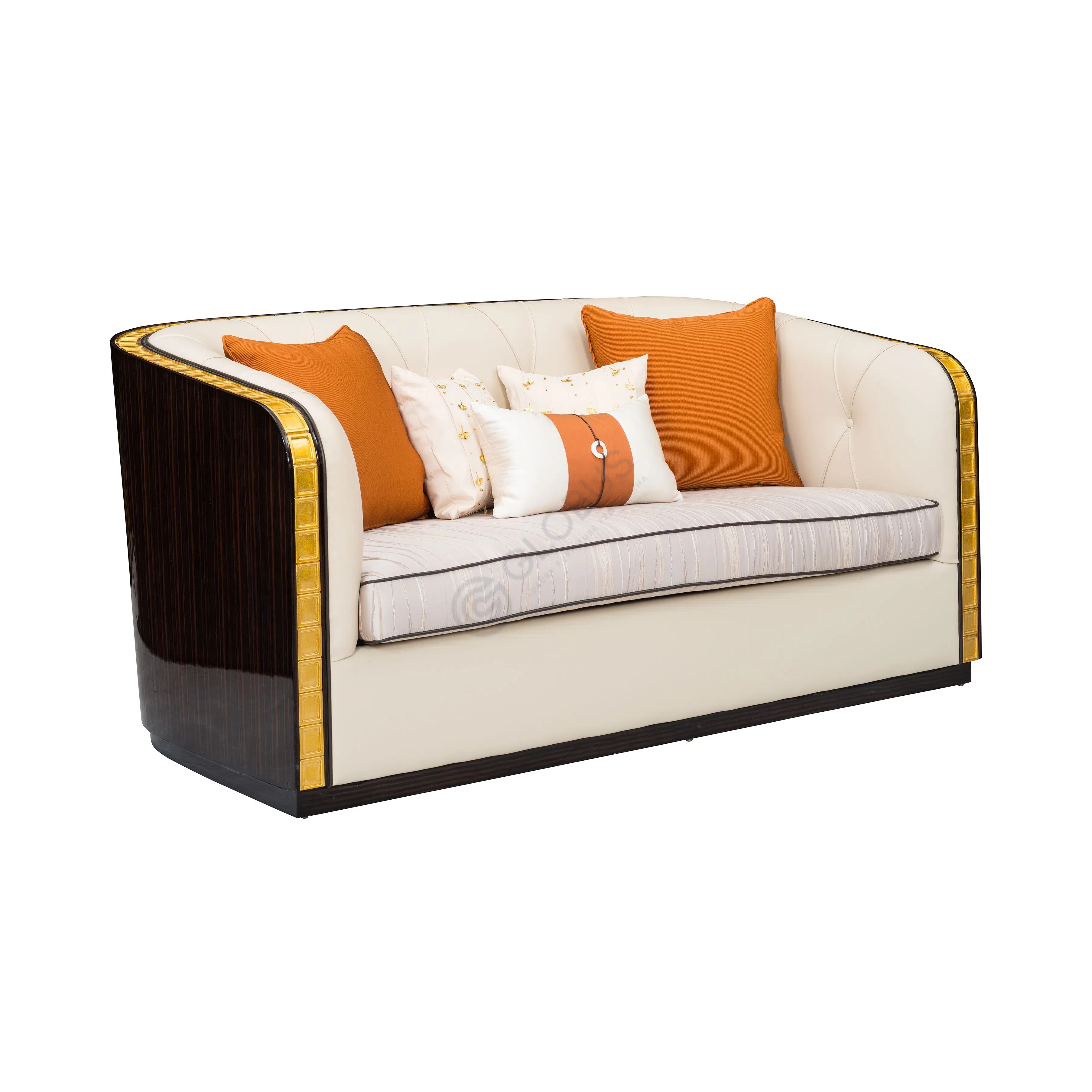 A distinctive decorative trim runs along the graceful curves of the arms and back. Composed of segmented elements with an amber or golden hue, this detail highlights the armchair's contemporary style while lending a unique visual accent.