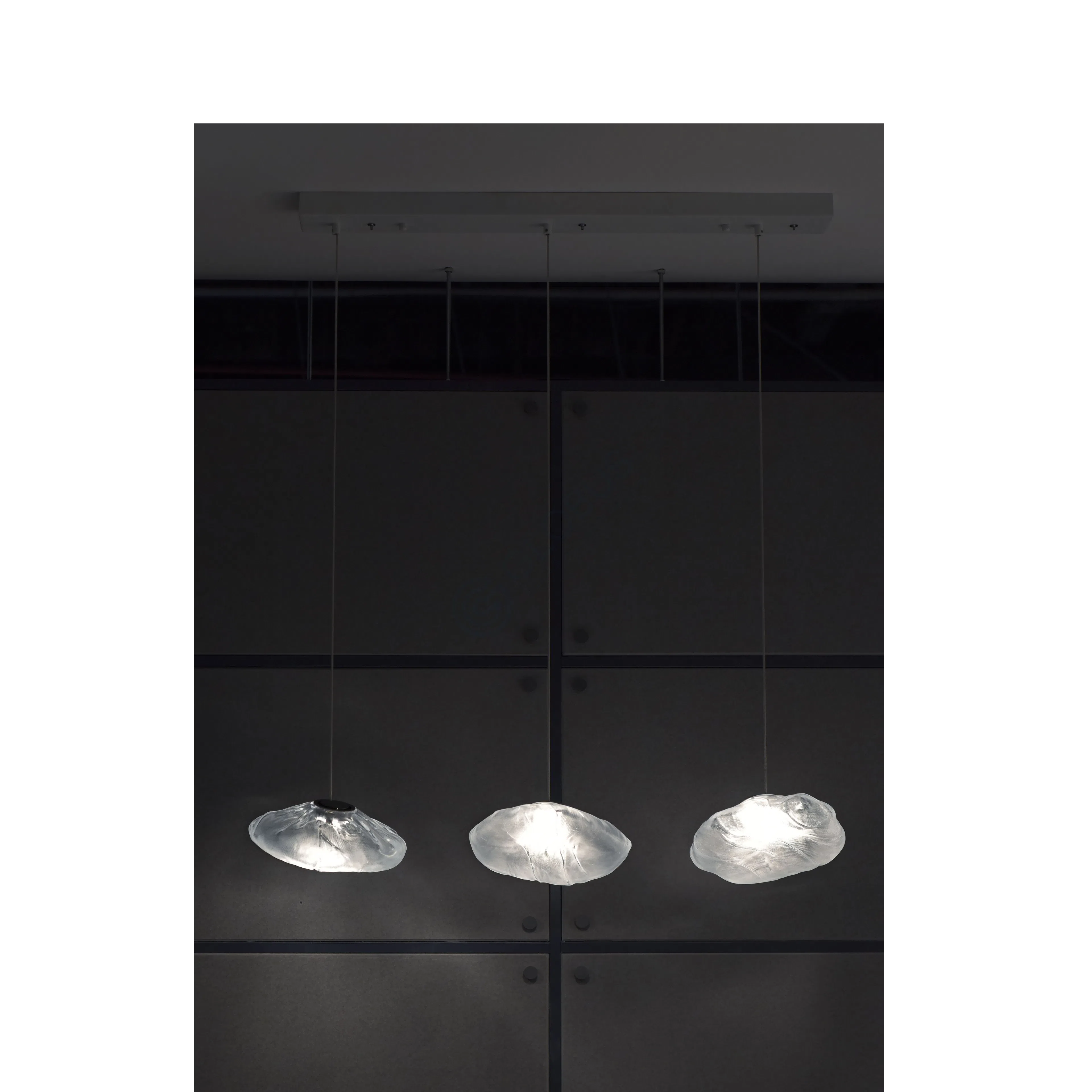 This modern pendant light features a delicate, fluid form crafted from translucent glass. Its unique silhouette appears to float effortlessly, creating a soft, diffused glow that brings a serene ambiance to any space. The design captures a sense of modern elegance with its gentle curves and subtle presence.