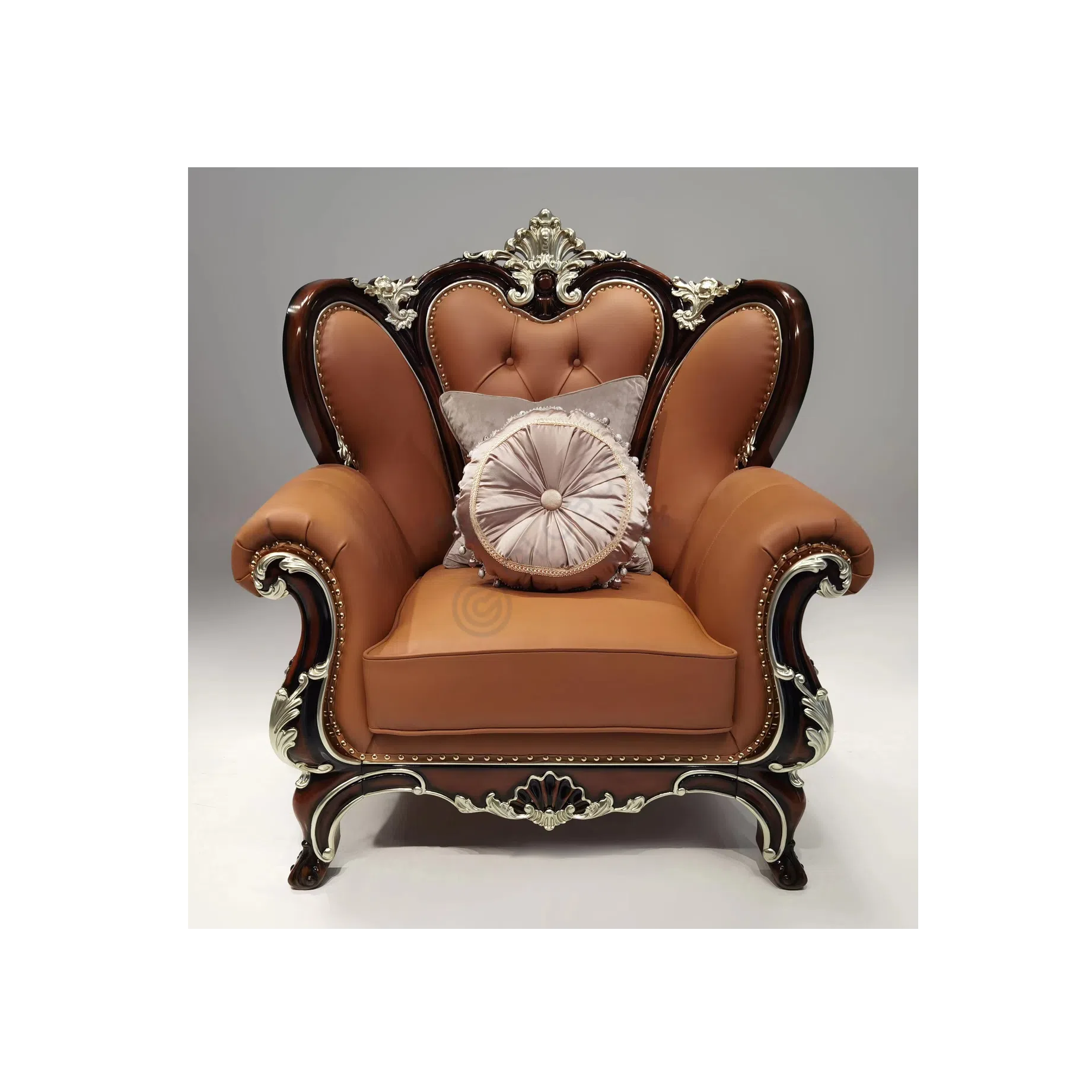 This sofa is a statement piece designed to bring classic European elegance into a living room. Its silhouette features gracefully curved arms and a high back, inviting a sense of formal comfort. The rich, warm tone of the upholstery adds a welcoming touch.
