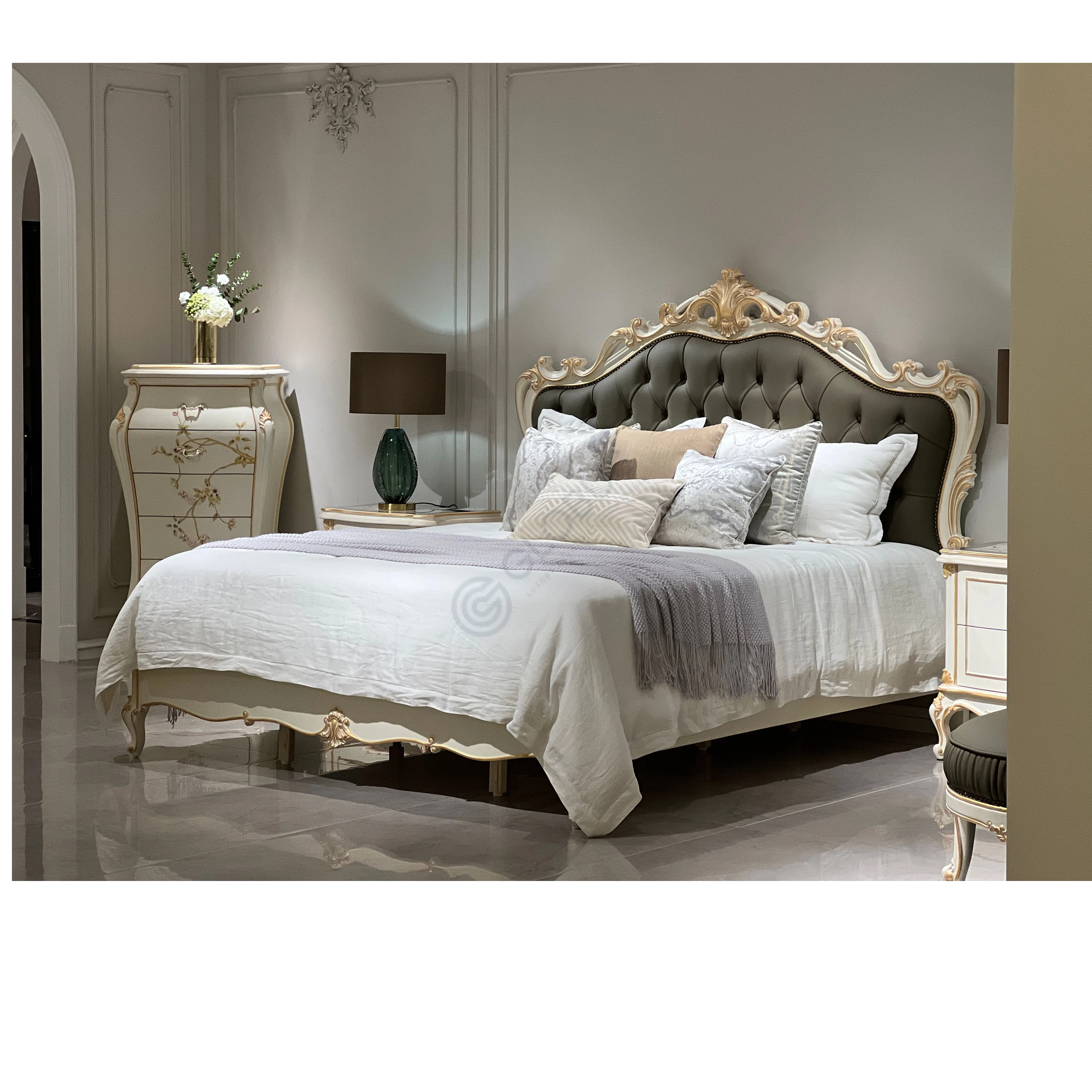 Intricate carvings highlight the detailed craftsmanship throughout the frame and legs, finished in a soft tone with delicate gold accents. The upholstery, offered in luxurious leather or soft microfiber leather, provides a comfortable and elegant surface. The back is detailed with sophisticated button tufting, adding visual depth and texture.