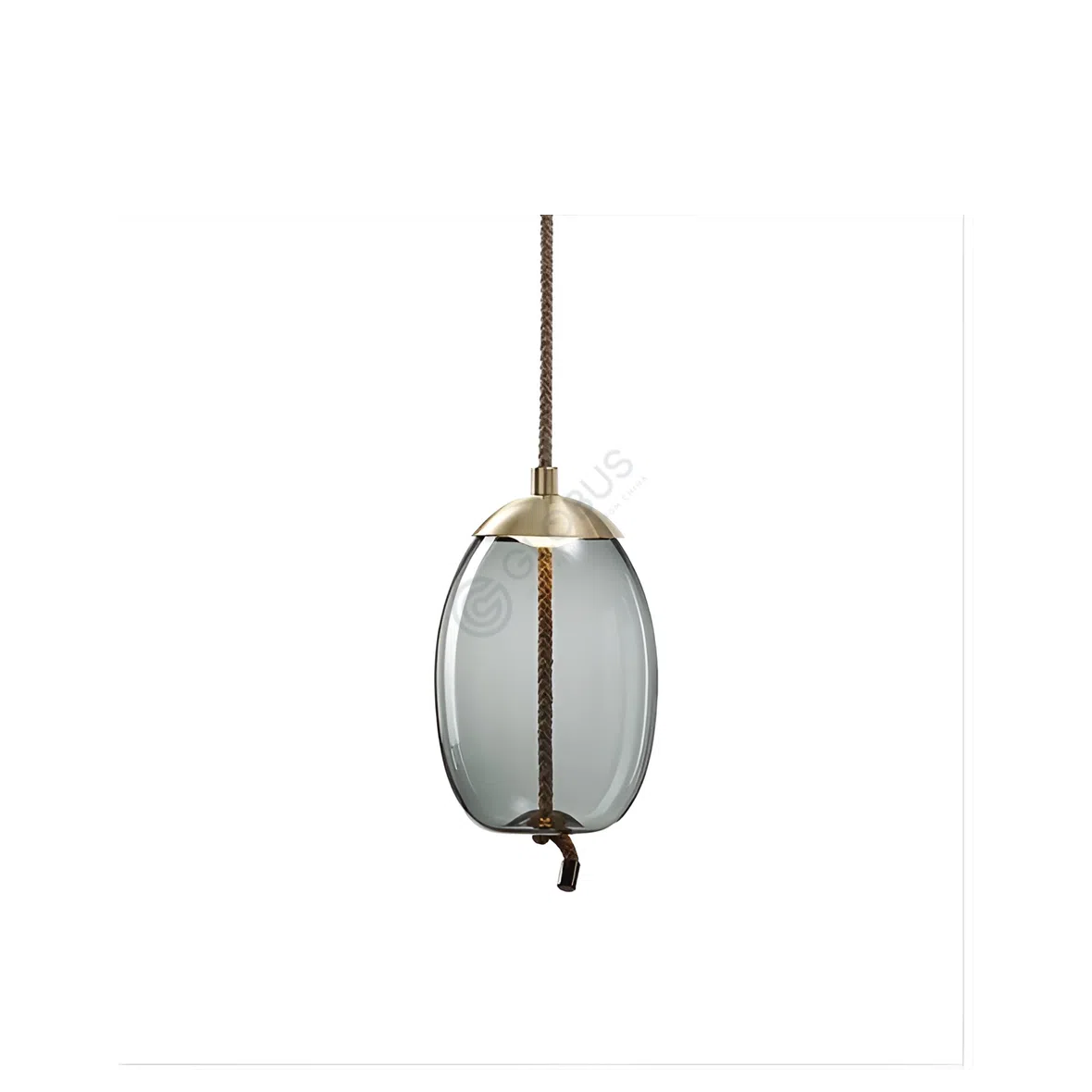 A prominent element within the glass shade is the textured rope detail, knotted and suspended, holding the integrated light source. This unexpected detail adds character and warmth to the otherwise sleek form. The lamp provides a gentle, diffused light that emanates from the base, complemented by a focused downlight from the rope element.