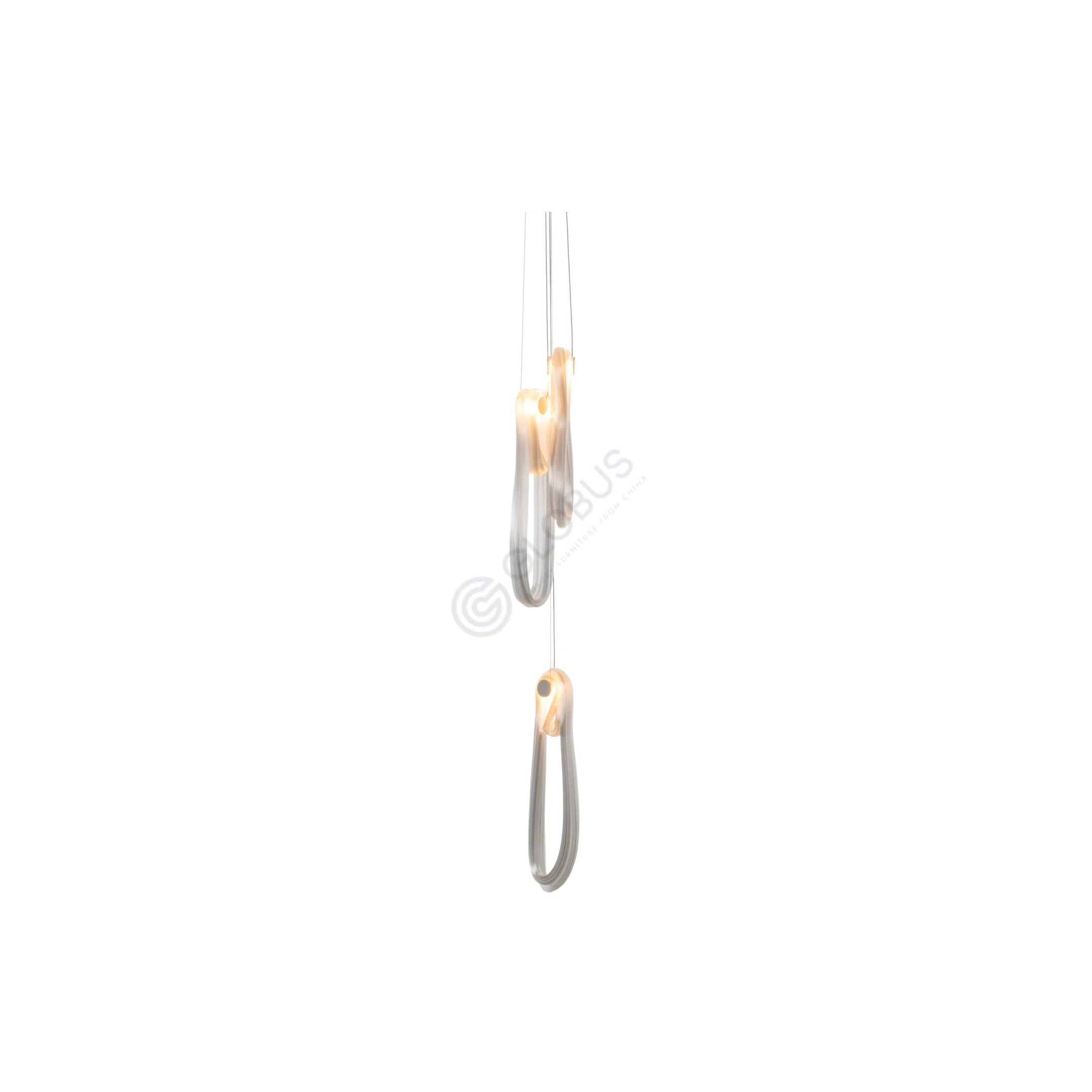 A minimal pendant light featuring a distinctive loop design in sleek aluminum. Suspended by a fine cable, the form presents a clean, modern aesthetic, highlighted by the small integrated light source nestled within the upper section of the loop structure. This design offers a subtle yet sophisticated visual element.