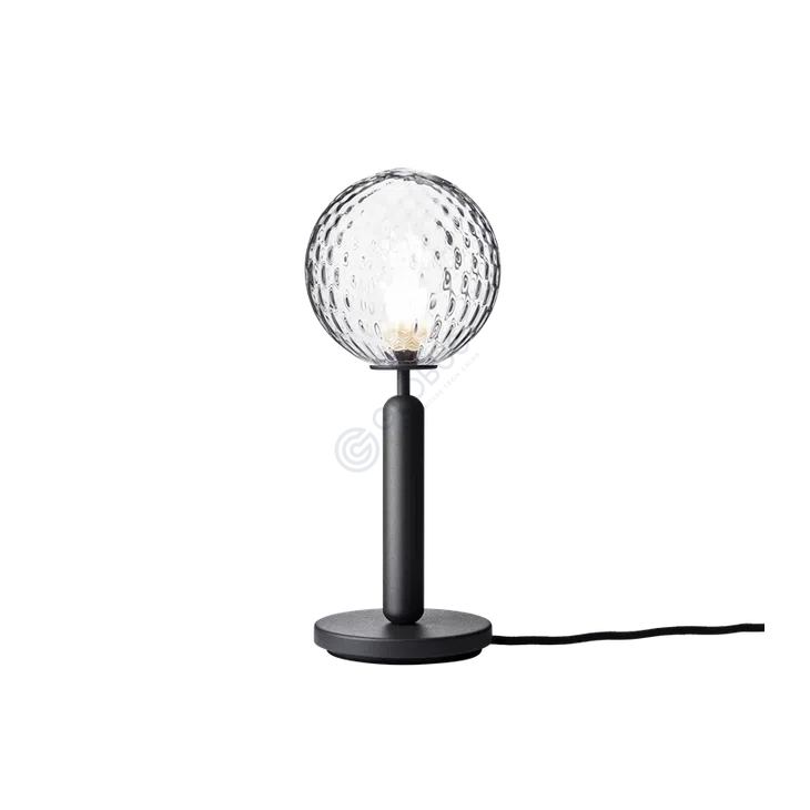 The lamp is constructed with quality materials, including iron and aluminum for the structure, providing a solid and elegant base. The metal components are finished in a dark tone, offering a striking contrast with the luminous glass globe and highlighting its intricate texture.