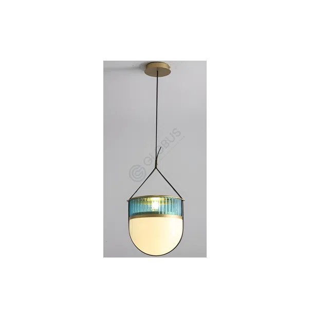 Crafted from fine metal and layered glass, the lamp's notable shade features a frosted inner globe encased in clear glass. A distinct blue ridged glass section sits atop, adding a touch of color and texture to the light source itself. The shade is suspended with a simple, refined connection.