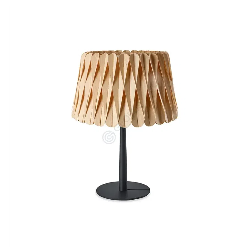 This pendant light features a distinctive shade crafted from multiple layers of solid wood elements, creating a textured, sculptural form. Each piece of wood is carefully arranged to form a unique pattern, giving the design a natural, organic feel while maintaining a clean, modern look.