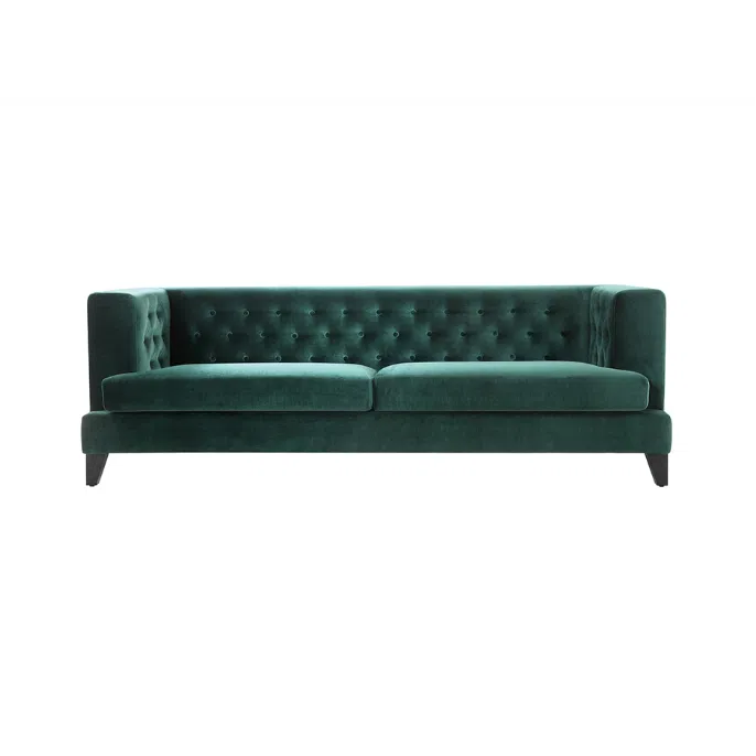 This modern armchair presents a bold yet refined addition to a living room. Upholstered in a deep green textile, it offers a touch of vibrant color and a soft, inviting texture. The design features a structured silhouette with clean lines, embodying contemporary style.