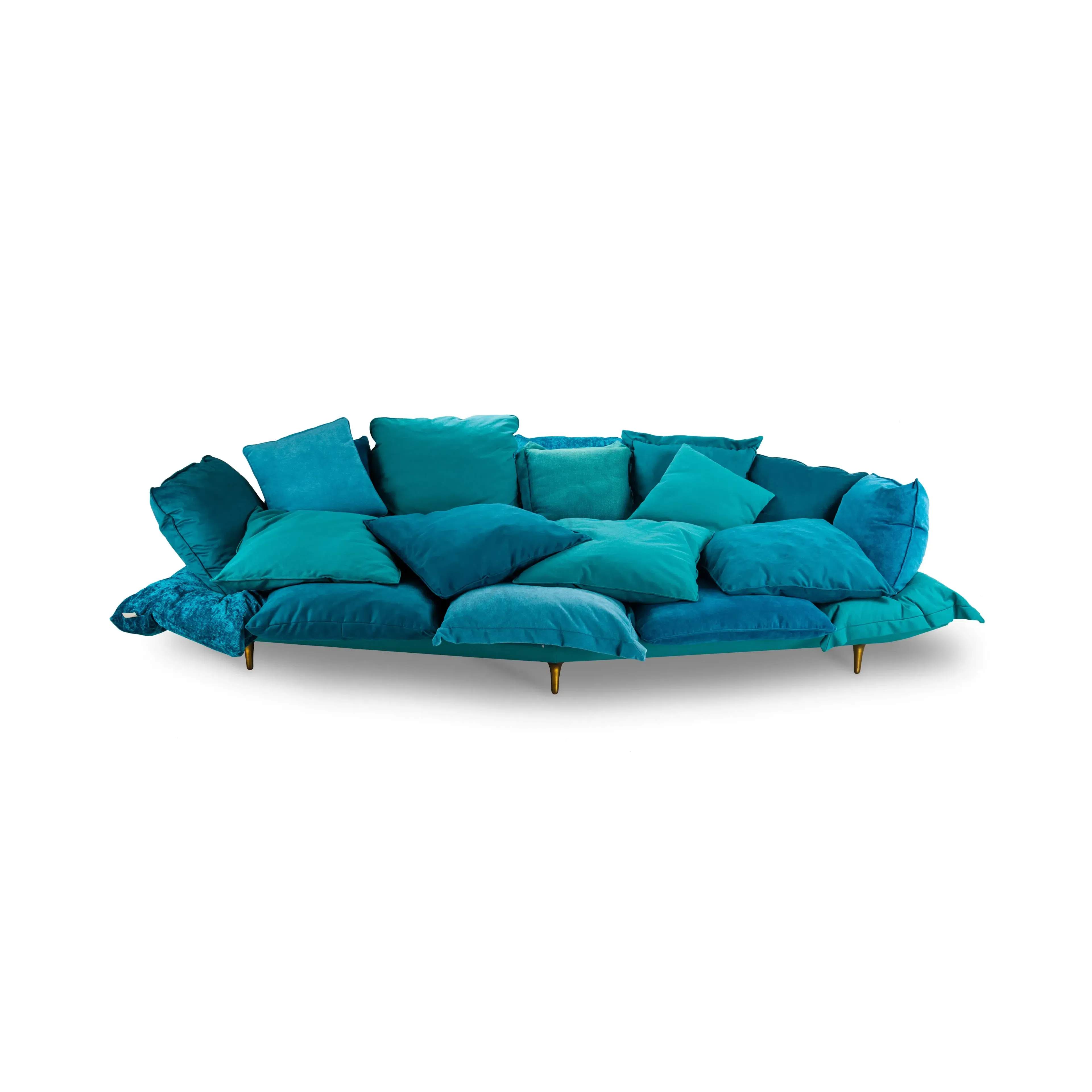 This modern armchair presents a captivating form built from an abundance of plush cushions. Upholstered in a soft textile, the cushions create a welcoming, enveloping shape in rich and lighter blue tones, inviting you to sink into comfort.