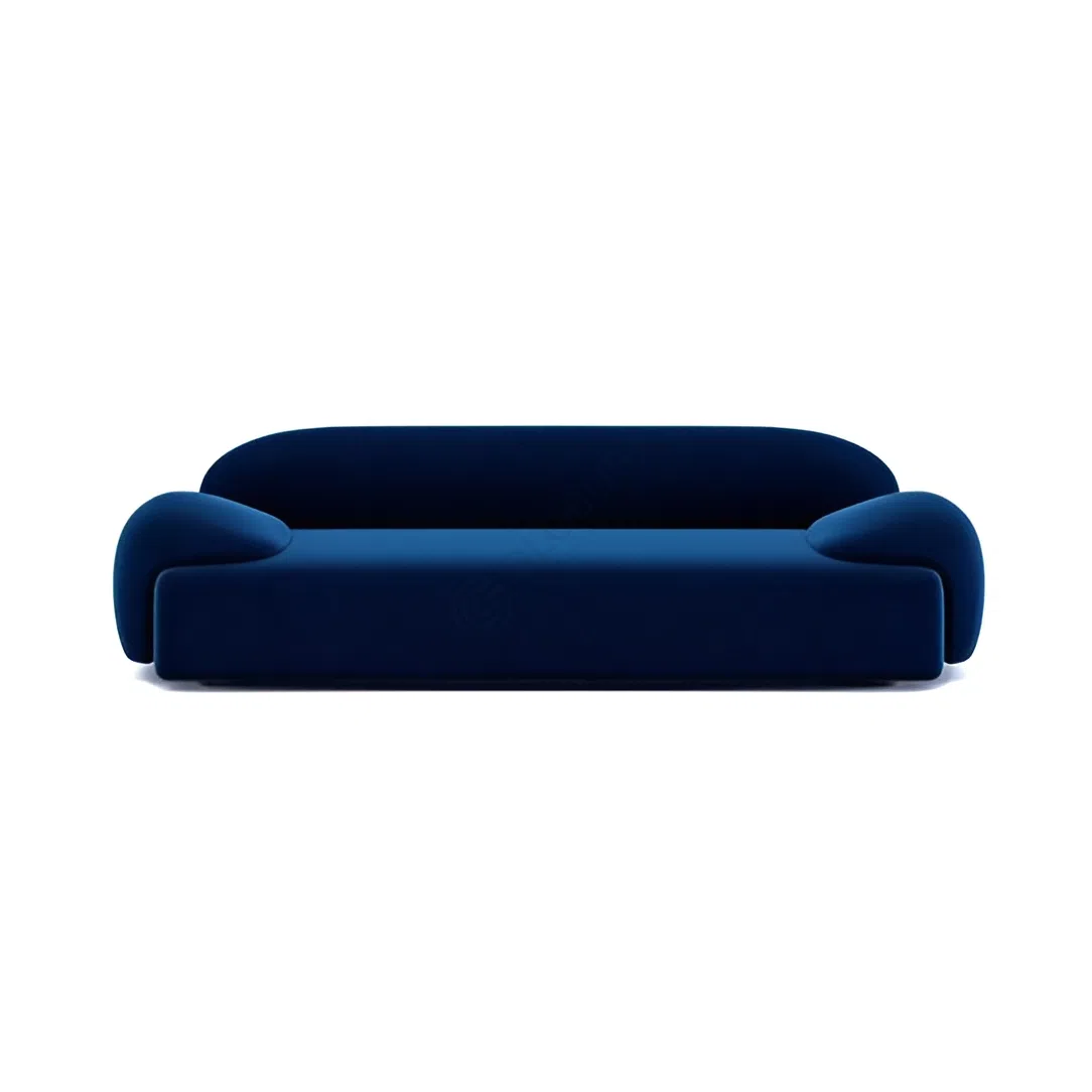 The distinctive curved back flows seamlessly into integrated armrests, giving the piece a fluid, sculptural quality. A solid wood structure provides a stable foundation, hidden by the smooth upholstery, emphasizing the chair's clean, contemporary lines.