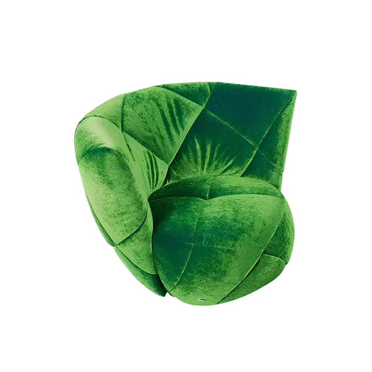 This round pouf brings a vibrant splash of color and modern style into a room. Its spherical form is covered in a rich green textile, offering a soft and inviting appearance.