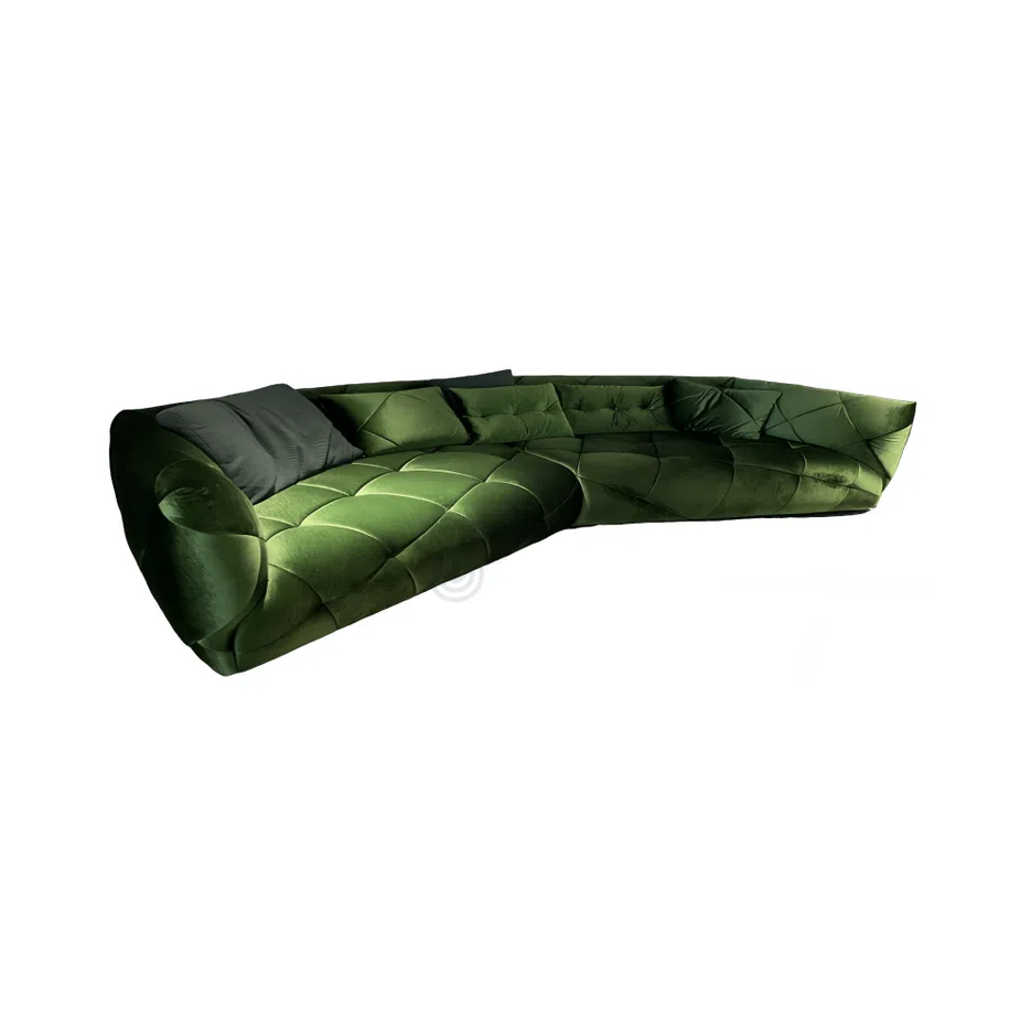The surface features a unique tufted pattern, creating distinct segments across the pouf. This detail adds visual depth and enhances the plush texture of the fabric, providing both comfort and elegant design.