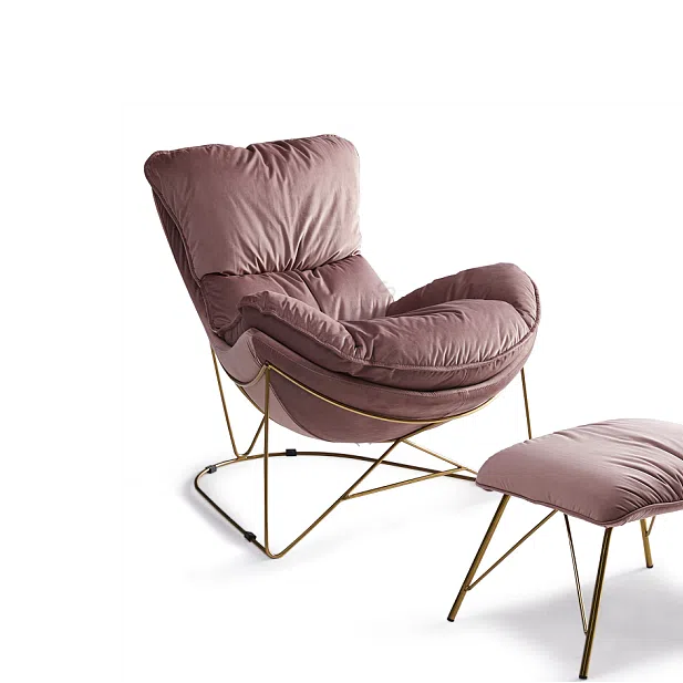 This modern pouf presents a plush, soft textile cushion set upon a sleek metal base. The tailored upholstery exhibits subtle folds, suggesting comfort and a gentle texture, likely velvet or a similar soft fabric, in a sophisticated dusty rose hue.